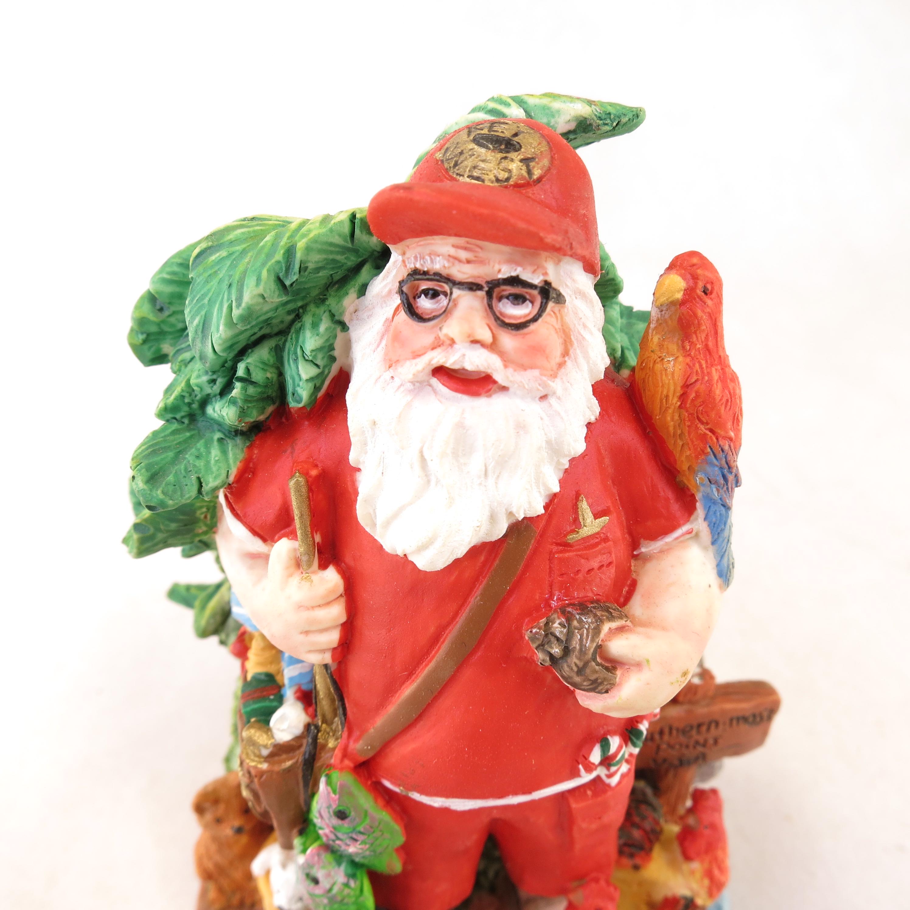 This charming Santa figurine measures 4.5" tall and is in good overall condition. It's made of hand painted resin with a maker mark on the bottom. Includes box.