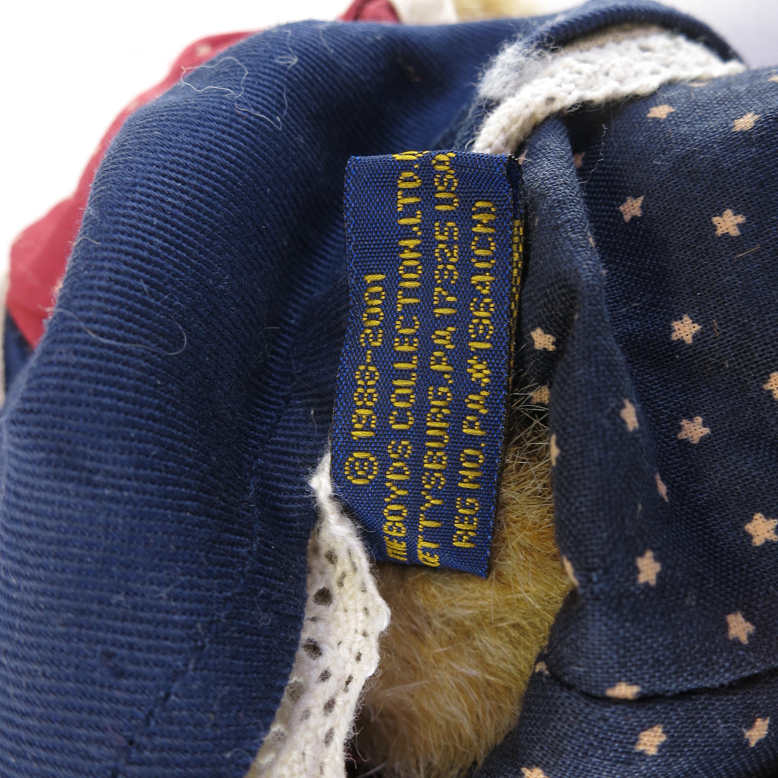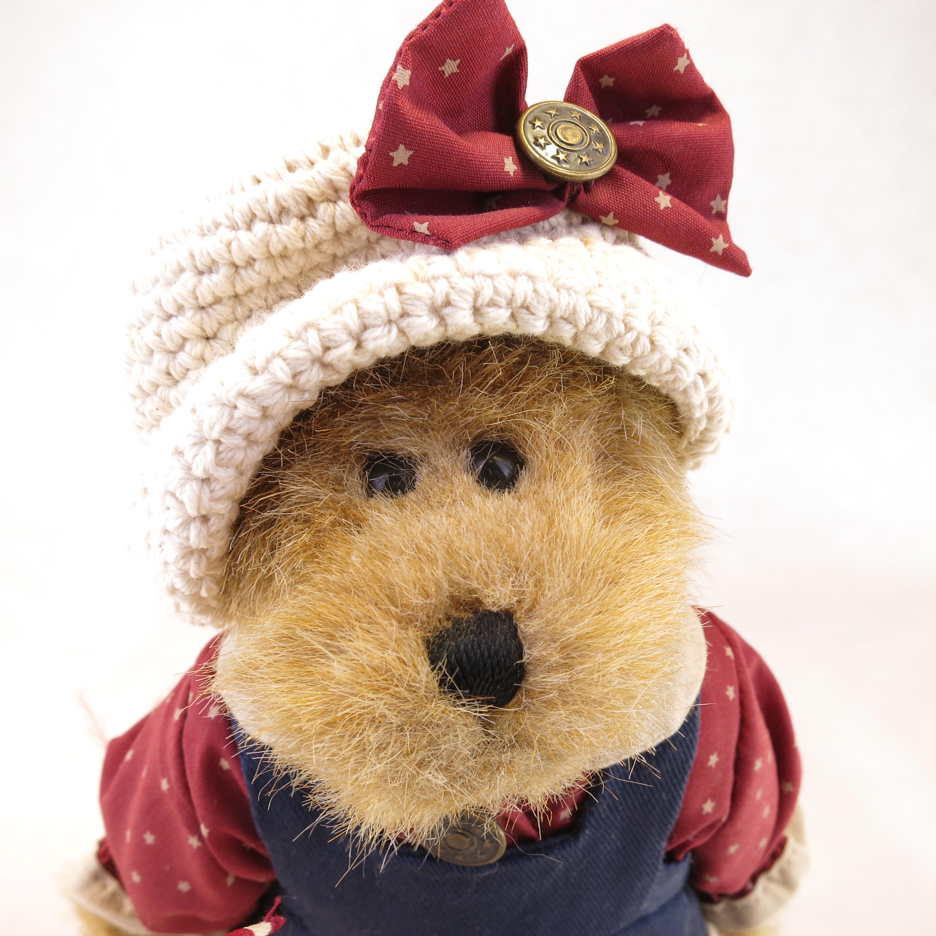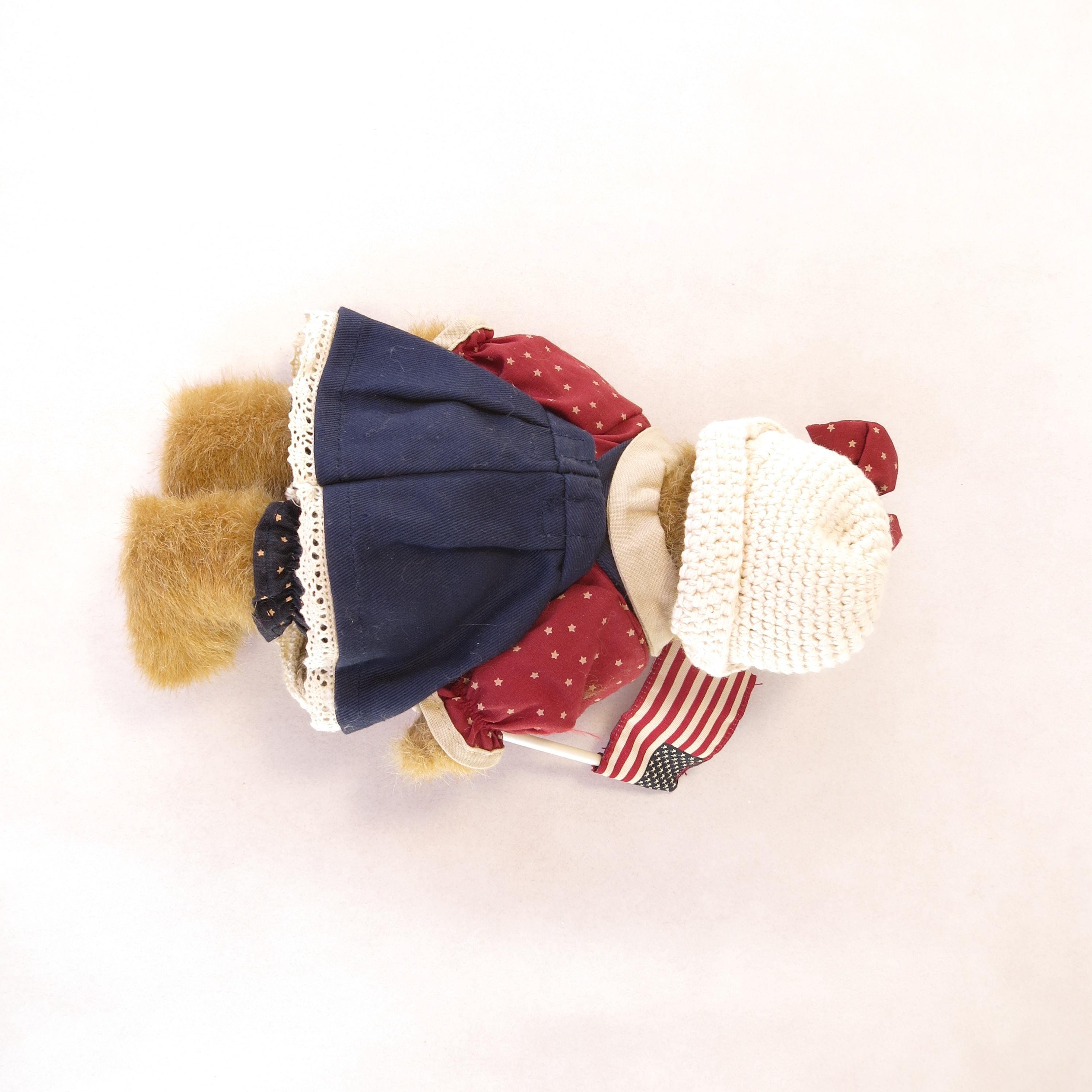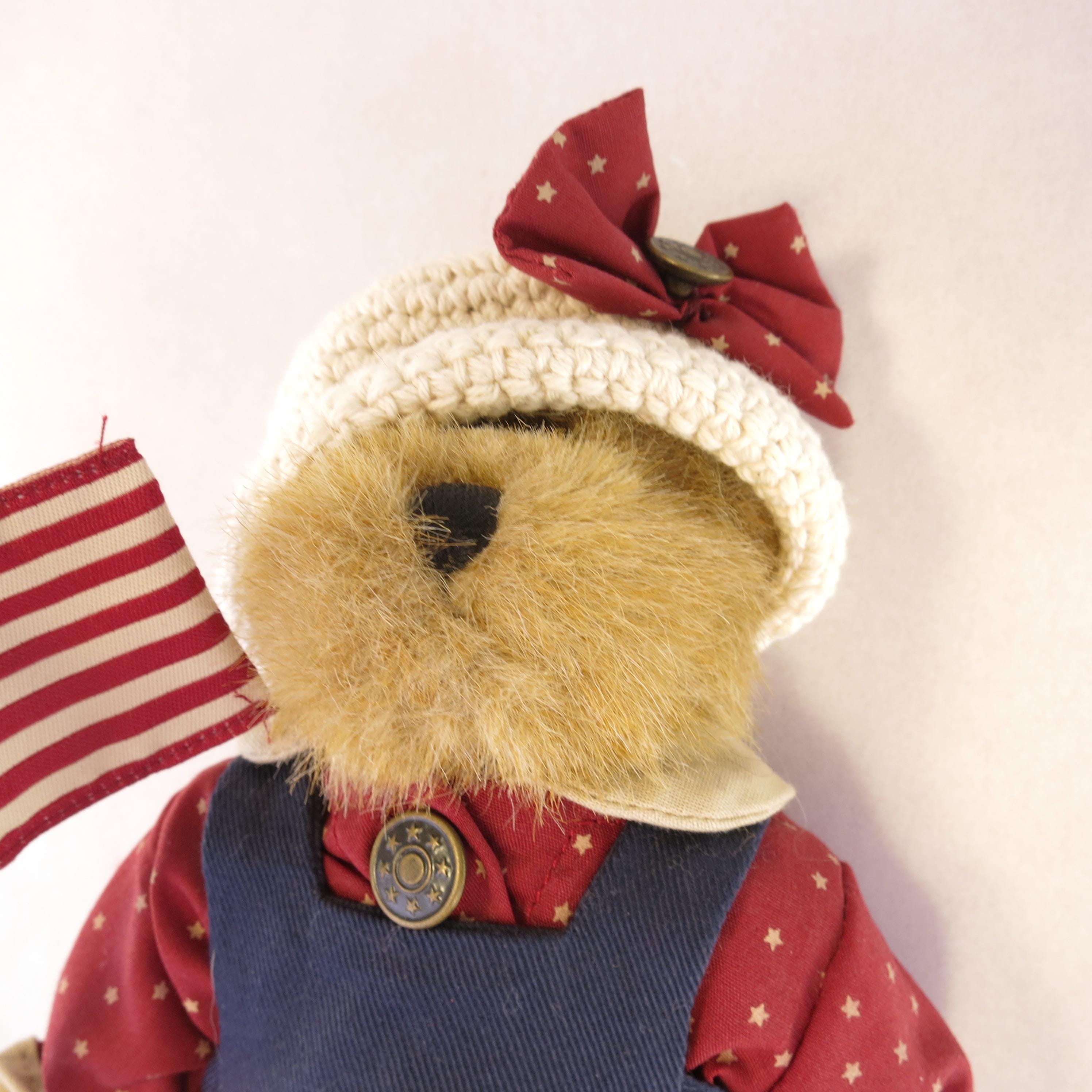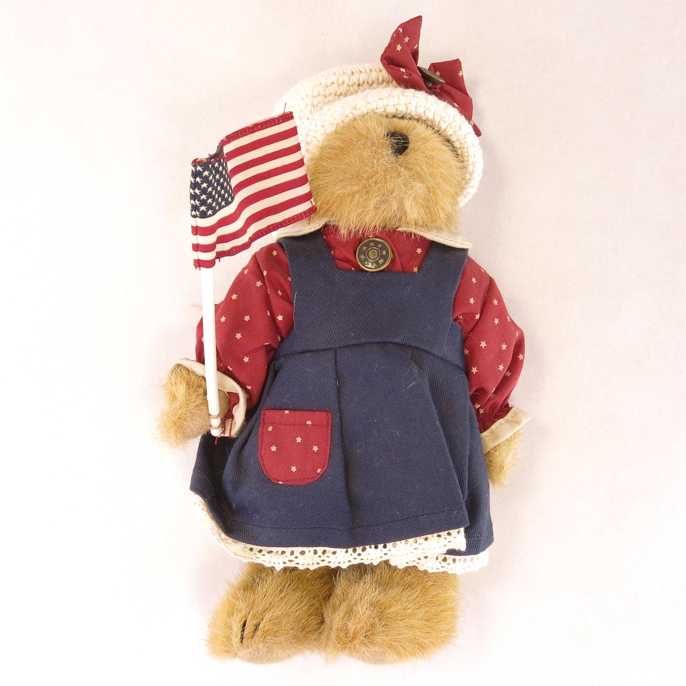 This charming little bear is holding a American flag.