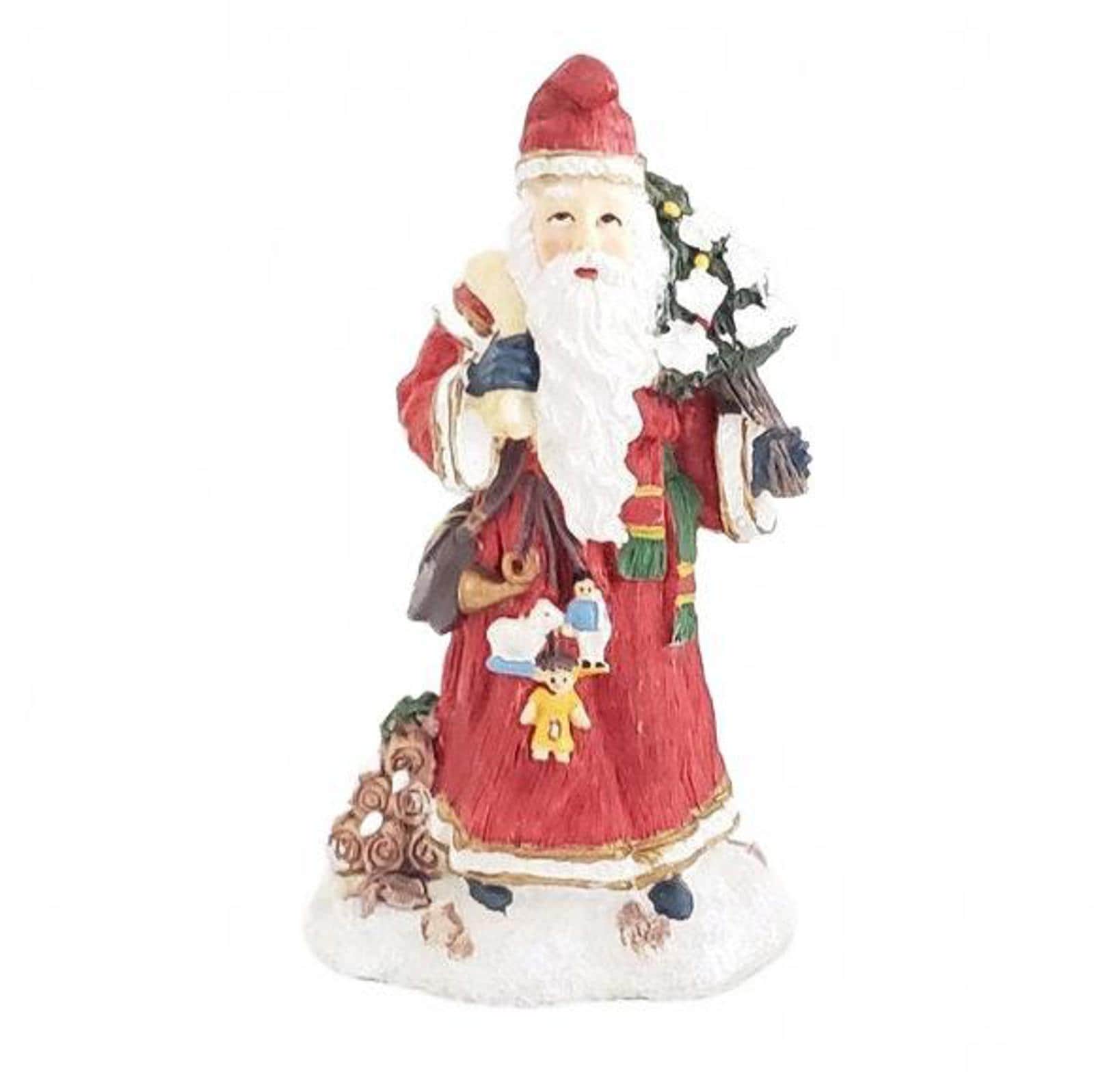 This charming Santa figurine measures 4.5" tall and is in good overall condition. It's made of hand painted resin with a maker mark on the bottom. Includes Box