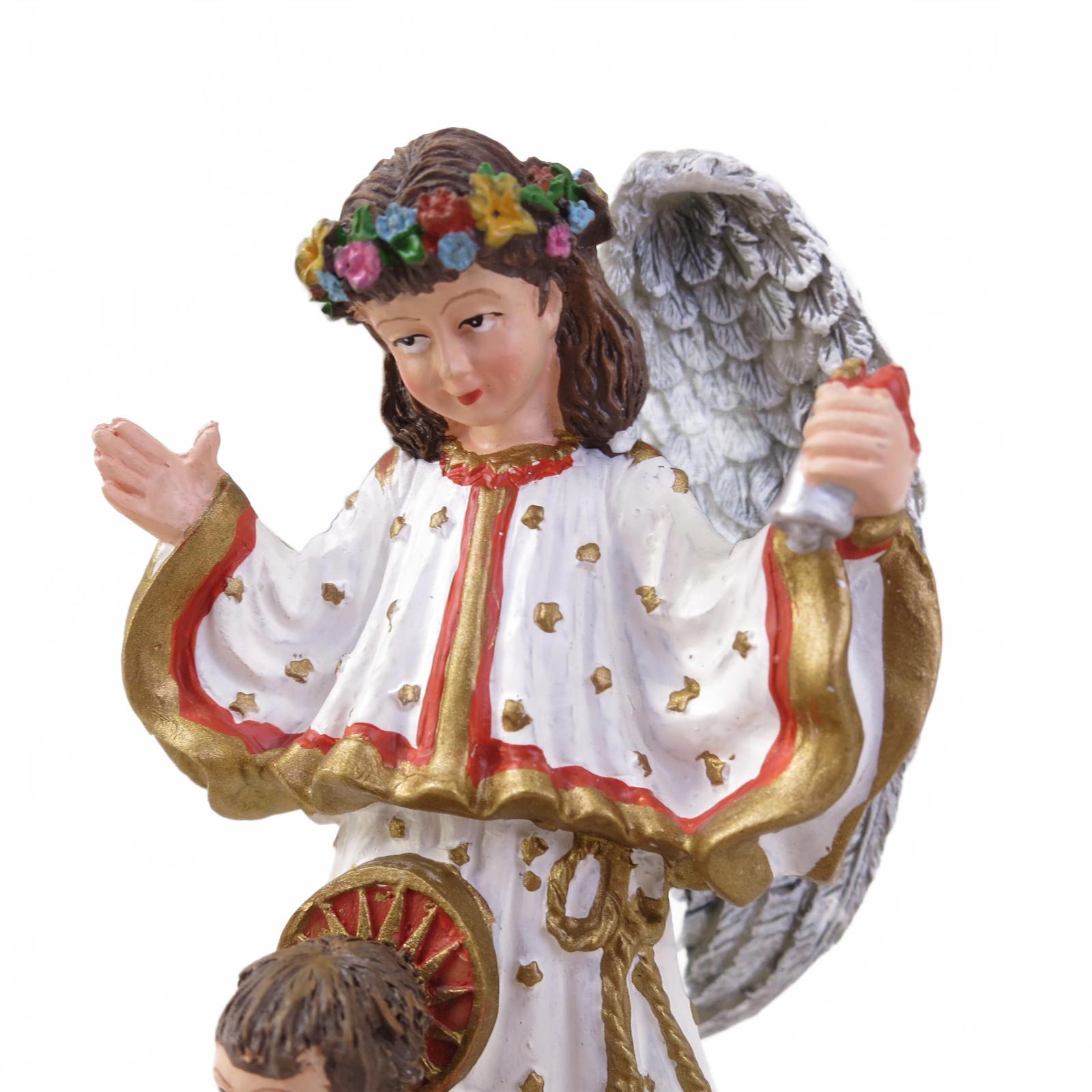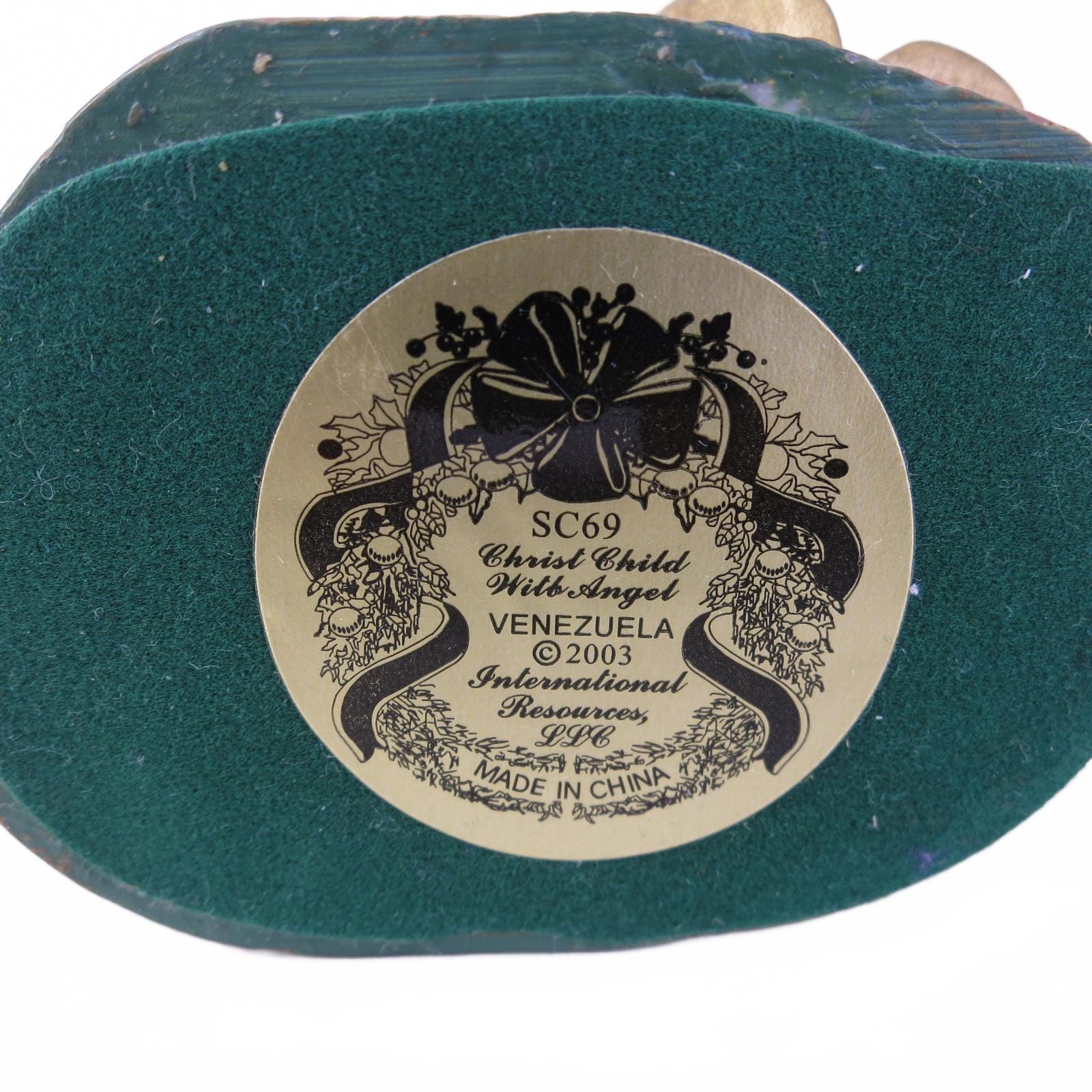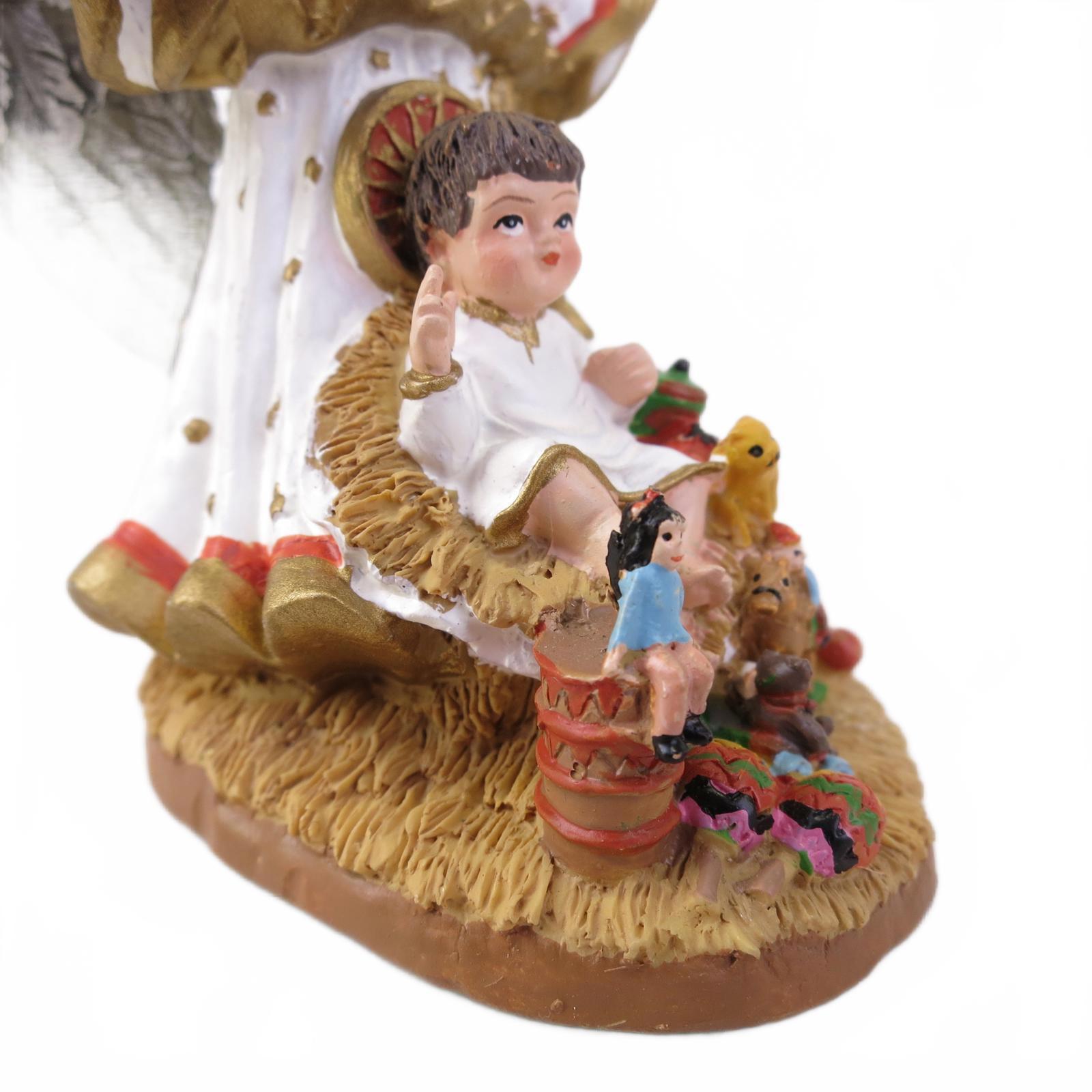 This charming Christ Child with Angel figurine measures 4.5" tall and is in good overall condition. It's made of hand painted resin with a maker mark on the bottom. Comes with Original Box.