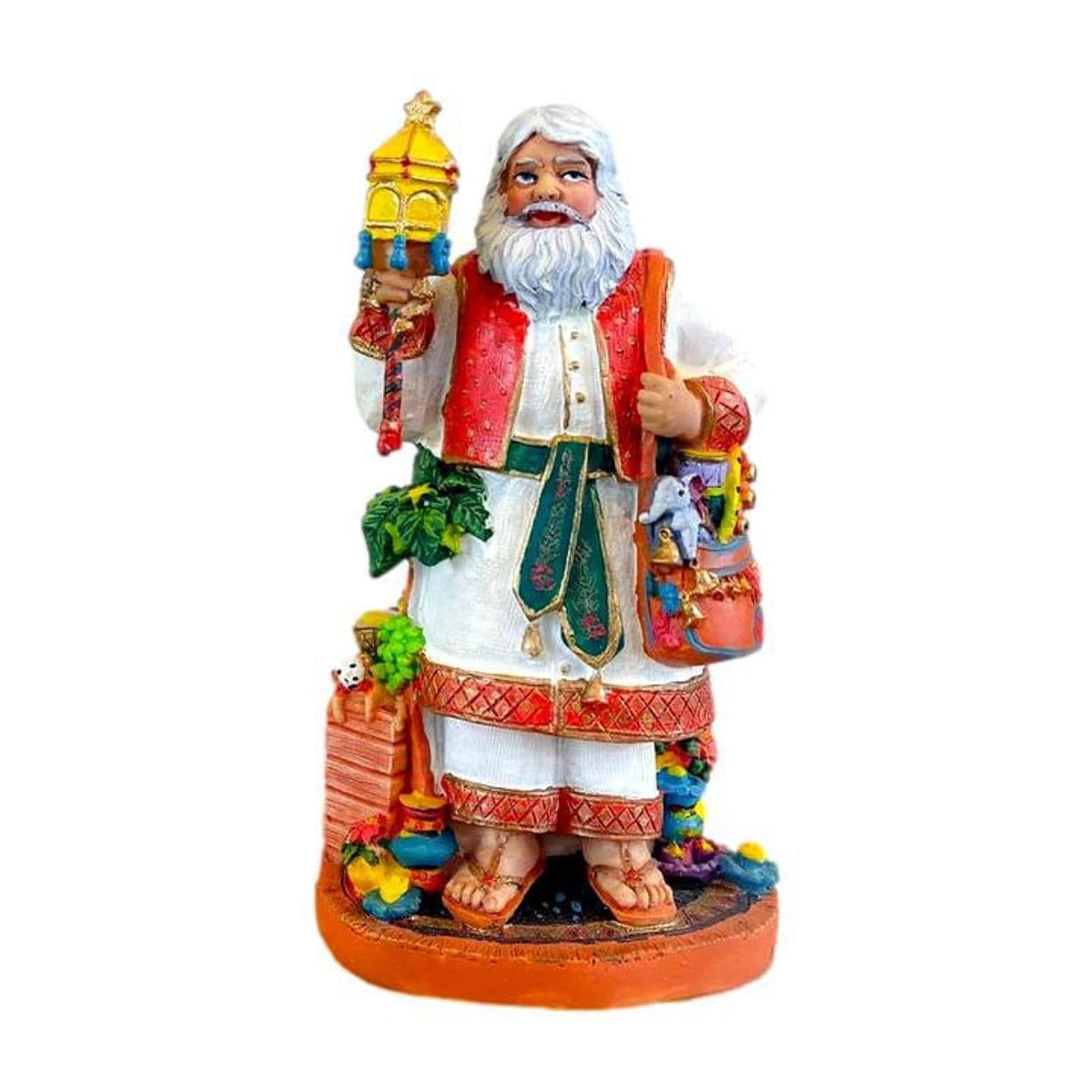 This charming Santa figurine measures 4.75" tall and is in good overall condition. It's made of hand painted resin with a maker mark on the bottom. No Box.