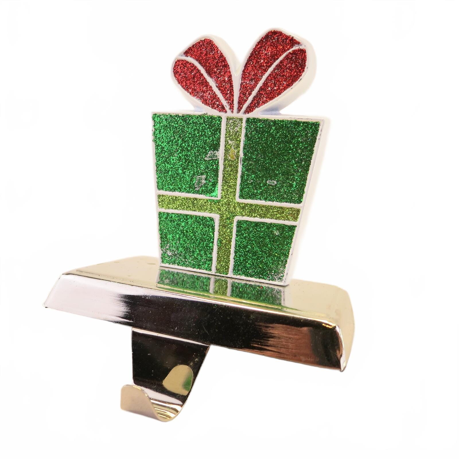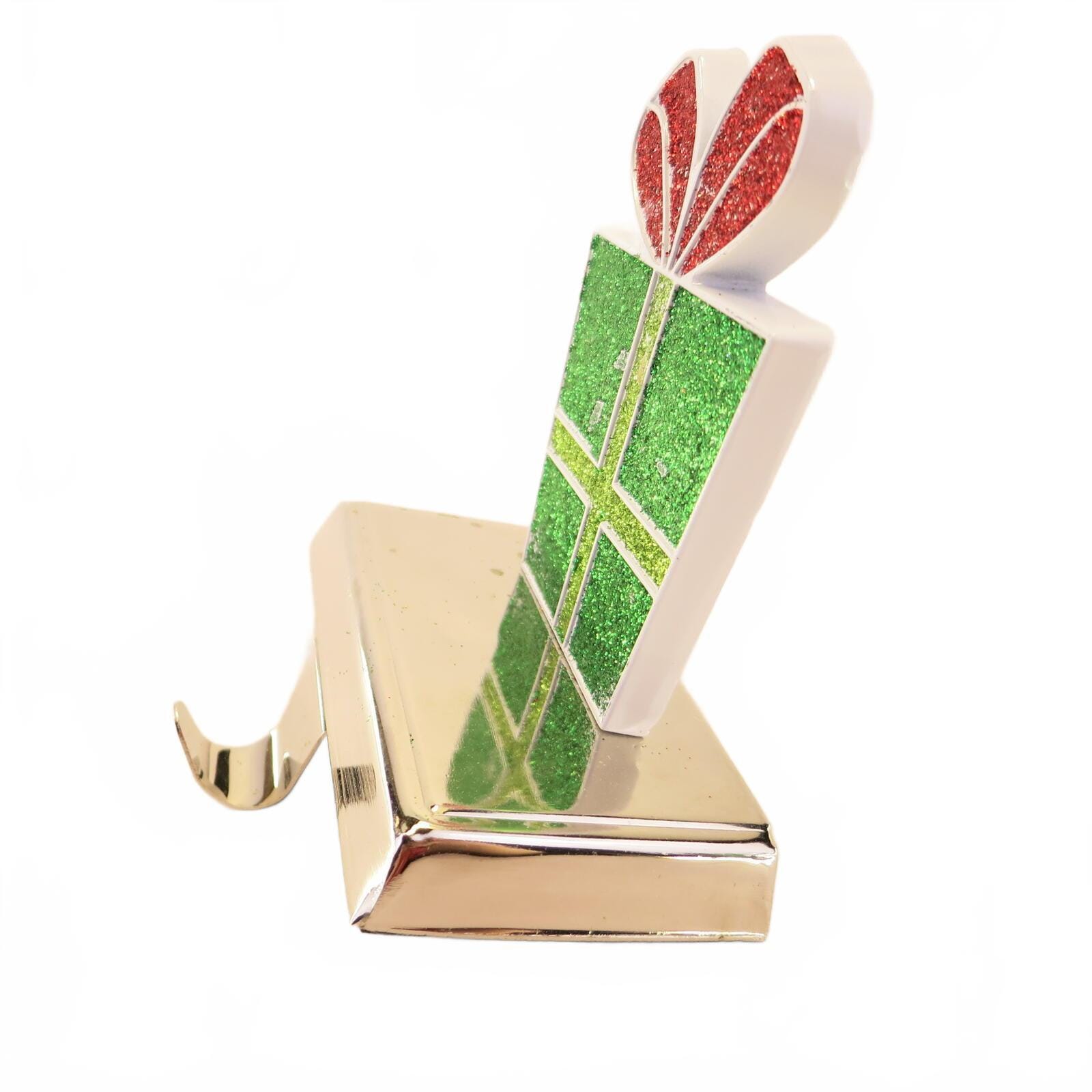 This snazzy stocking holder has a fun present design with chrome color base. Enamel on metal & heavy. 5" Tall