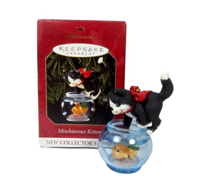 This 1999 Hallmark Keepsake Ornament features a very playful kitten who seems to want a goldfish as a friend.