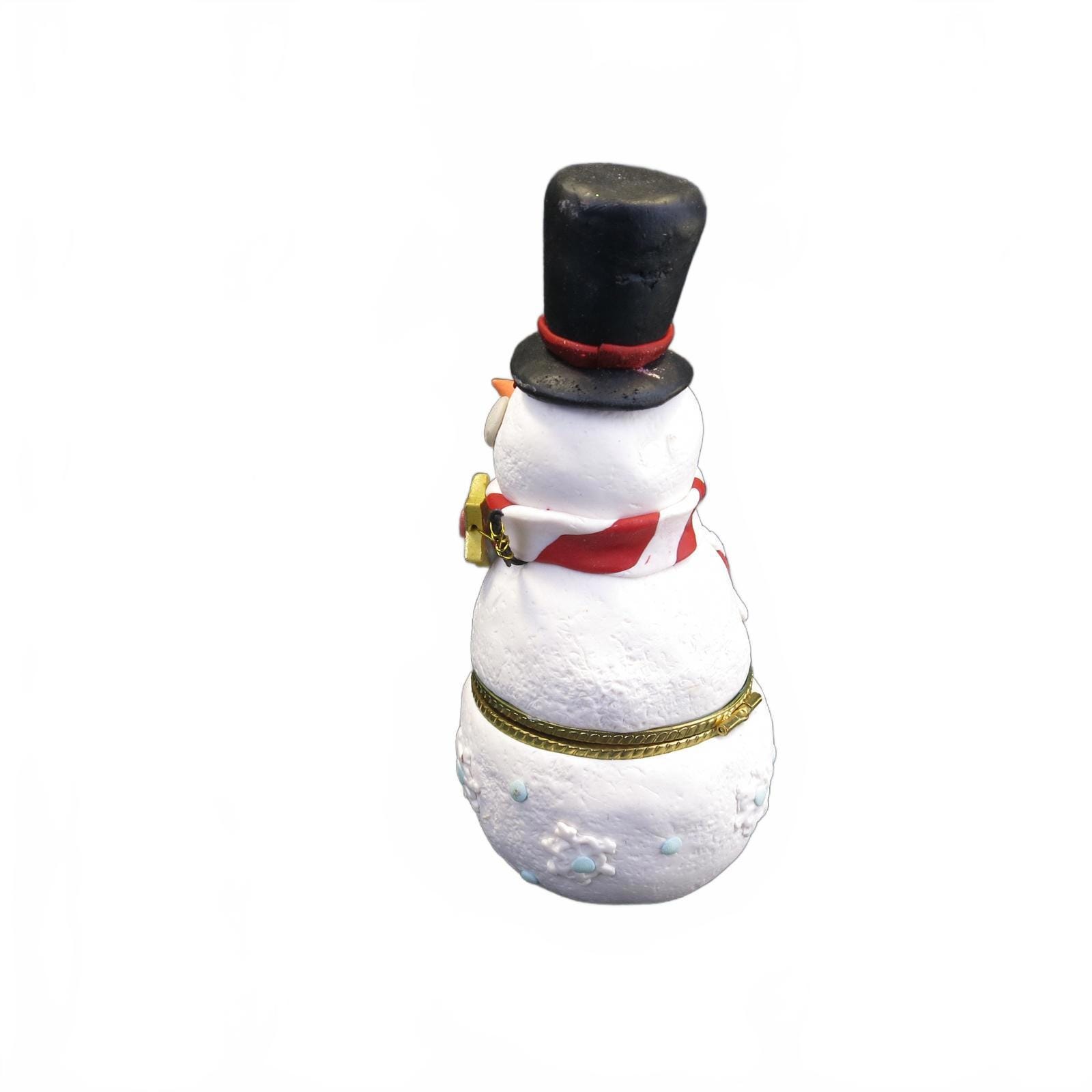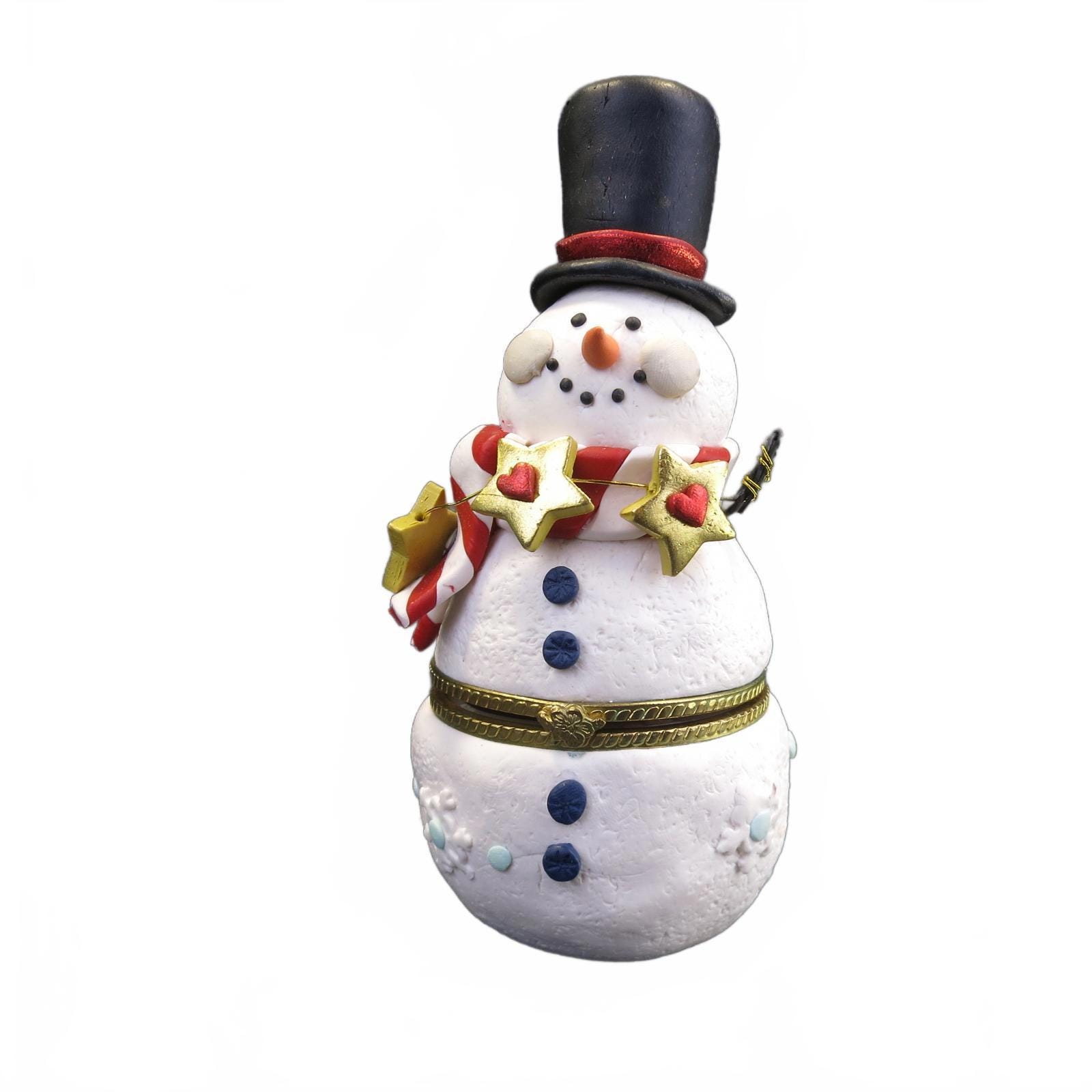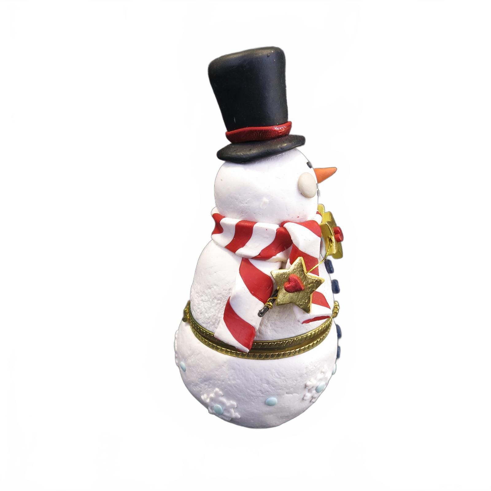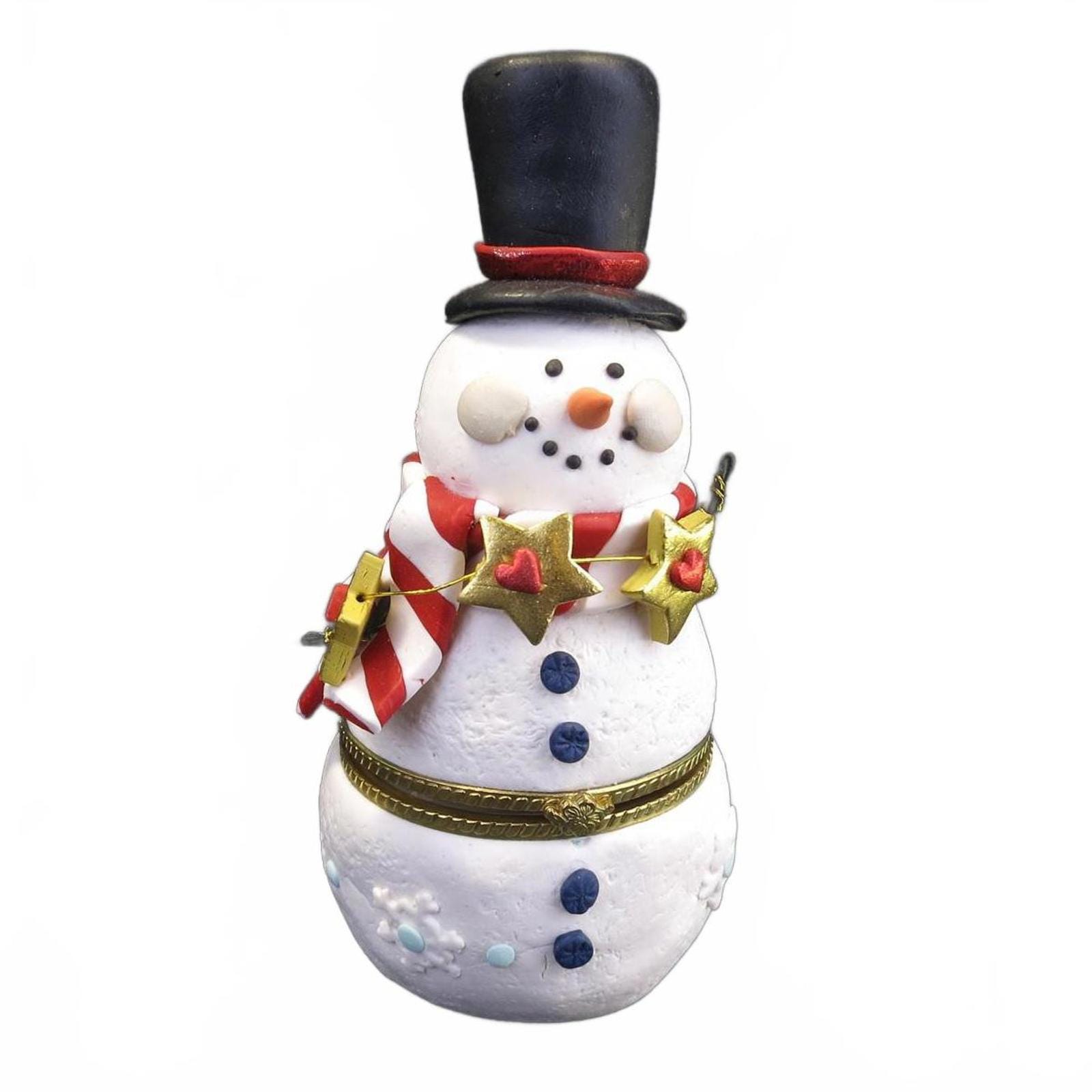 This groovy snowman trinket box was made in 90's & It's in good overall condition...a few indentions in the clay. He's sporting an coat, hat, scarf and holding garland. 5.75" tall & made of clay. 1998 Enesco.