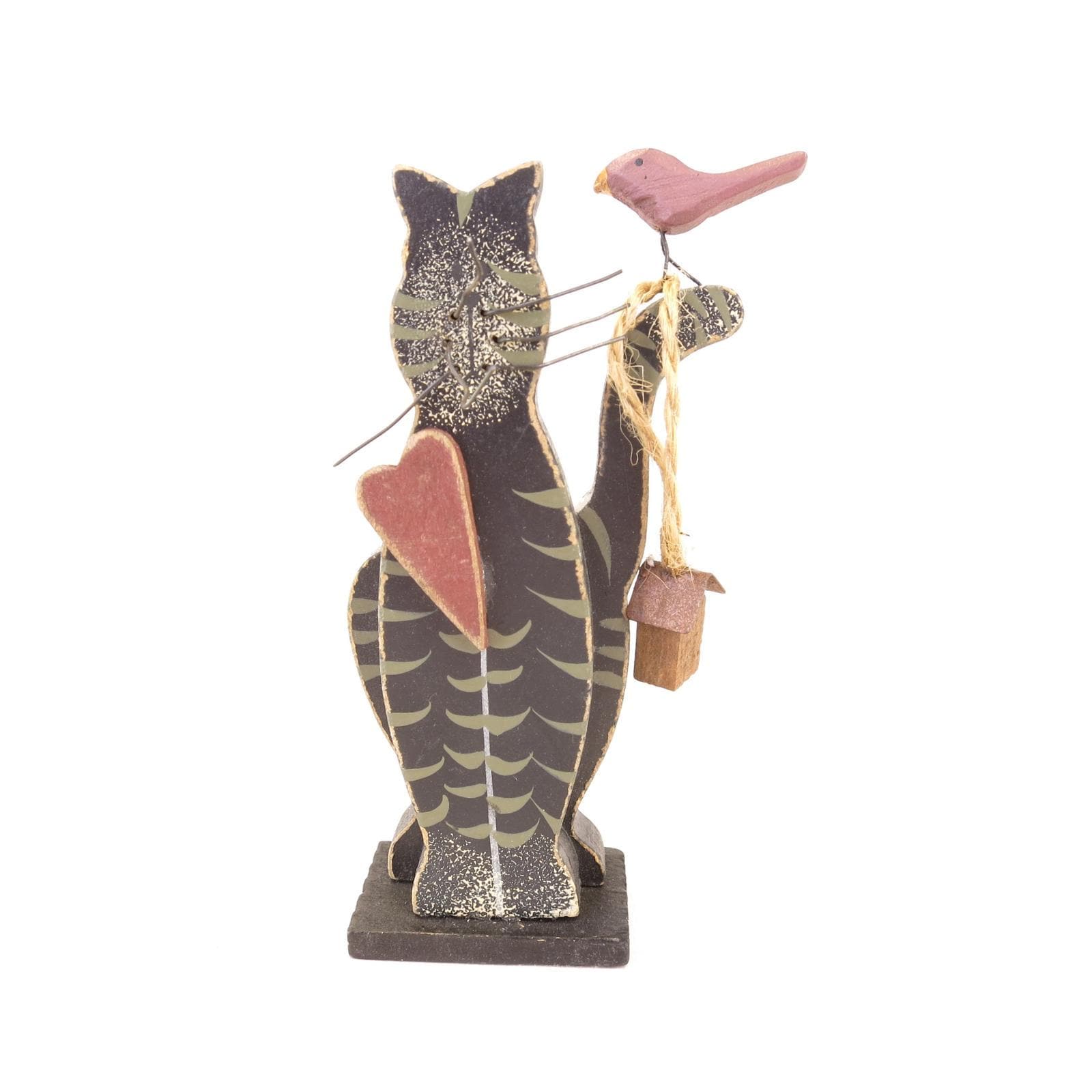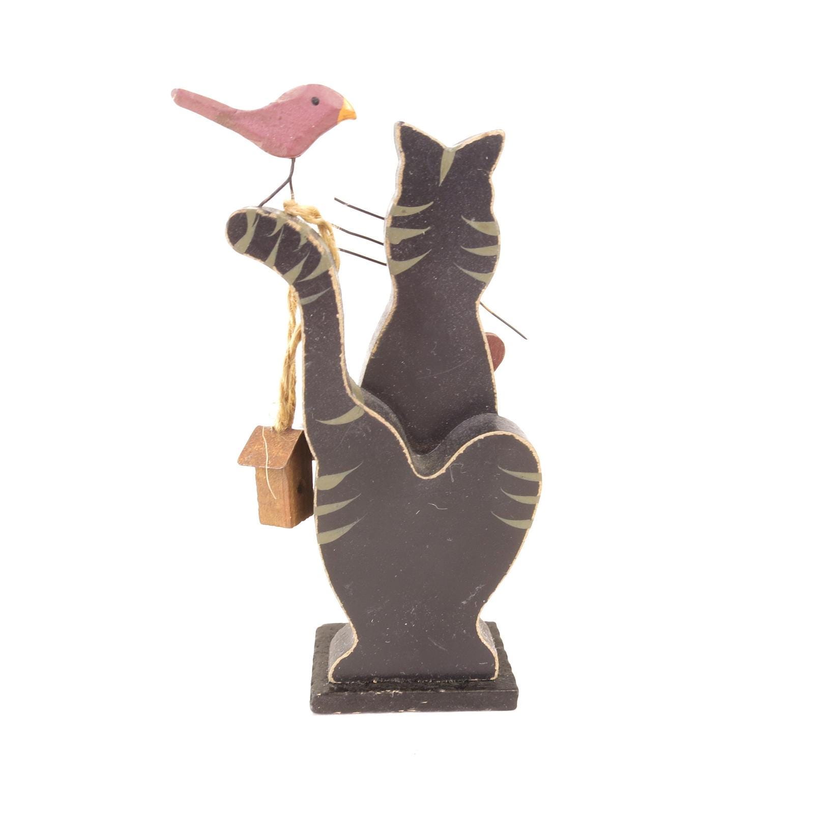 Item is made of two jigsaw cut pieces of wood glued together and mounted on a wood base. Black and gray tabby cat has big red heart on chest 3-D metal wire whiskers. There is red bird perched on its tail and a small birdhouse hanging by a jute rope. Very good vintage condition.
