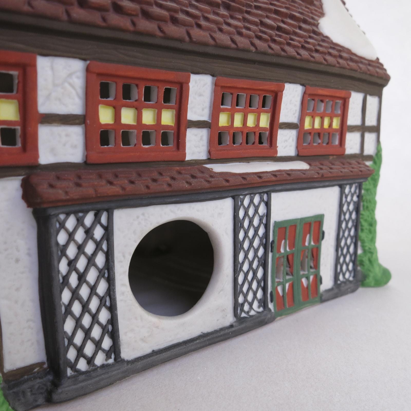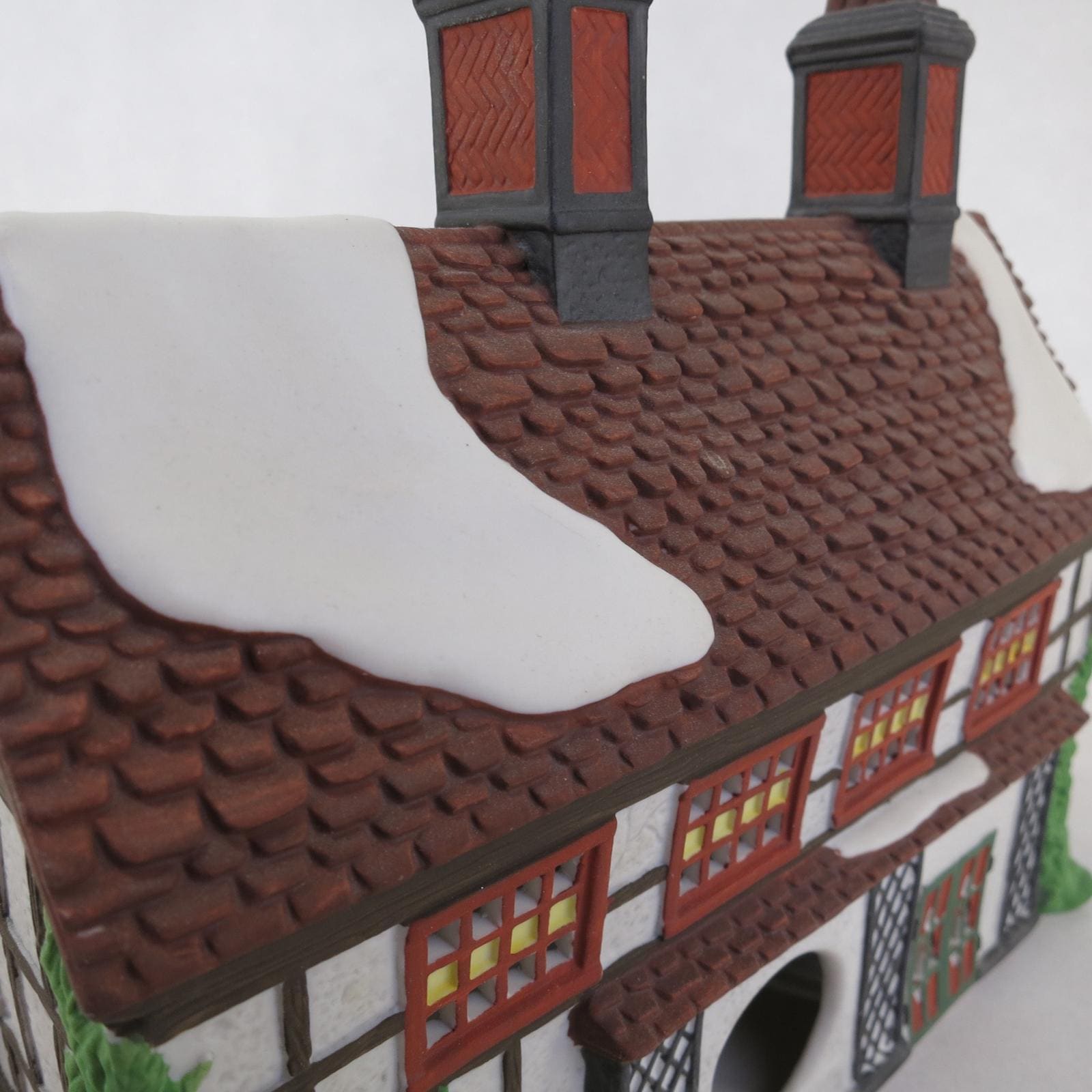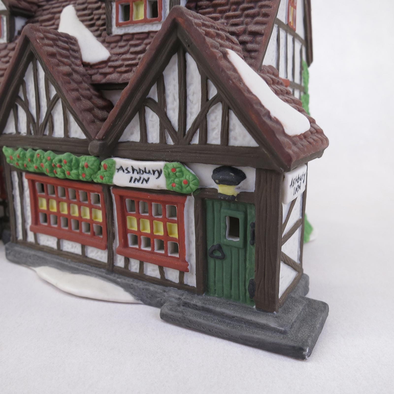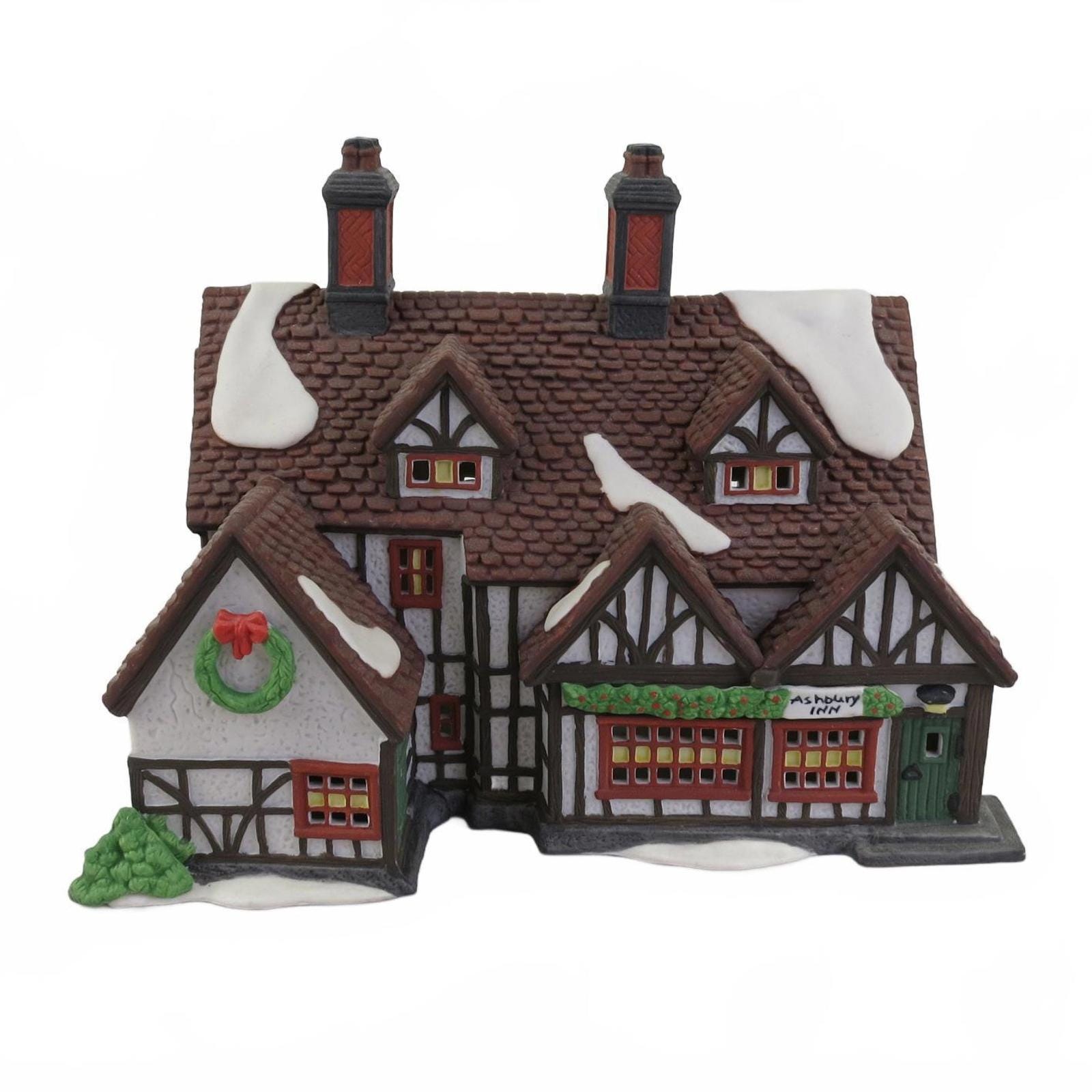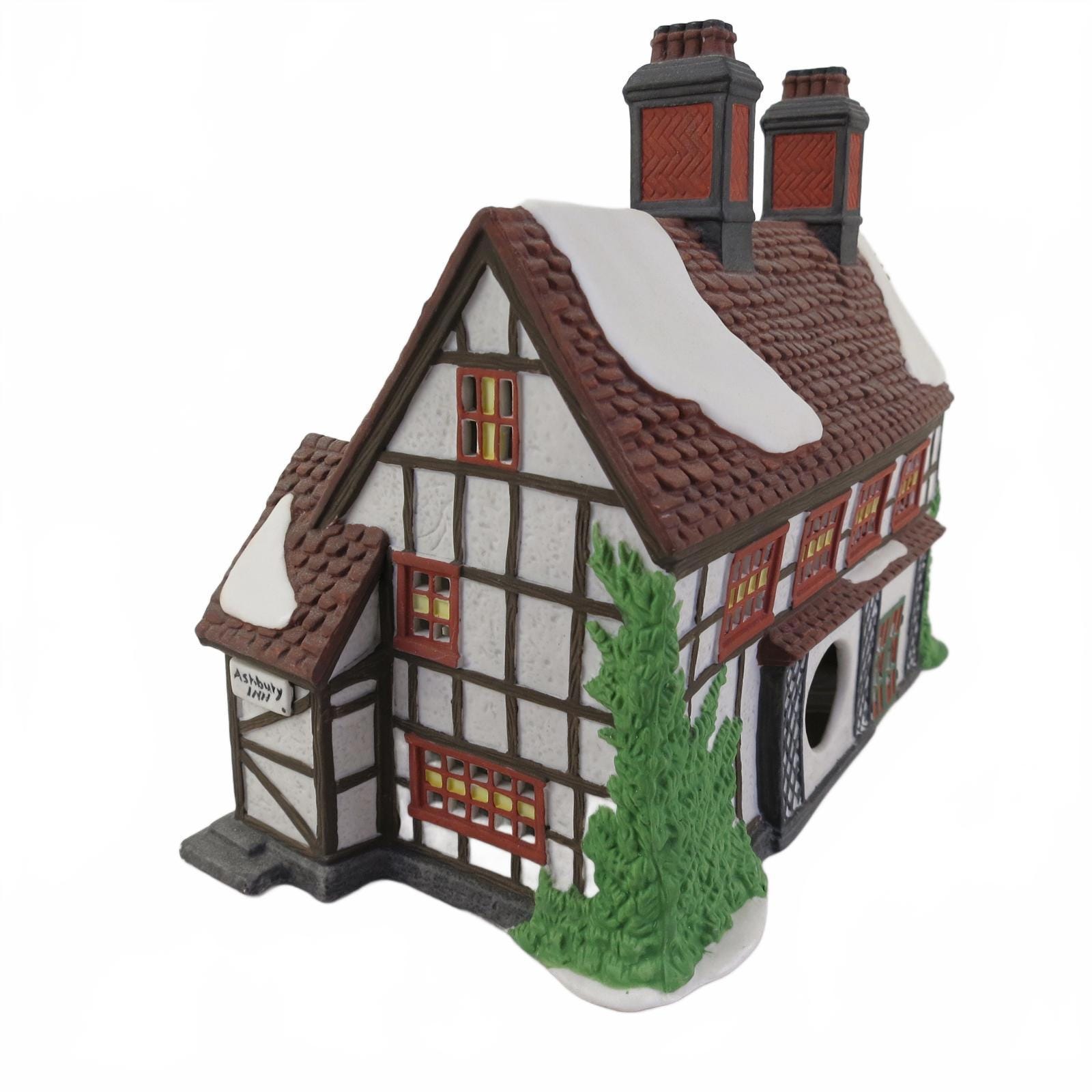 Ashbury Inn -Dickens Village, Item #55557, Issued in 1991 and retired in 1995. Tudor timbered inn for coach travelers. Food, lodging, and drink. Double chimneys, two roof dormers, and double peaks over multi-paned windows by entry. Size: 9.5 x 5 x 7.5''