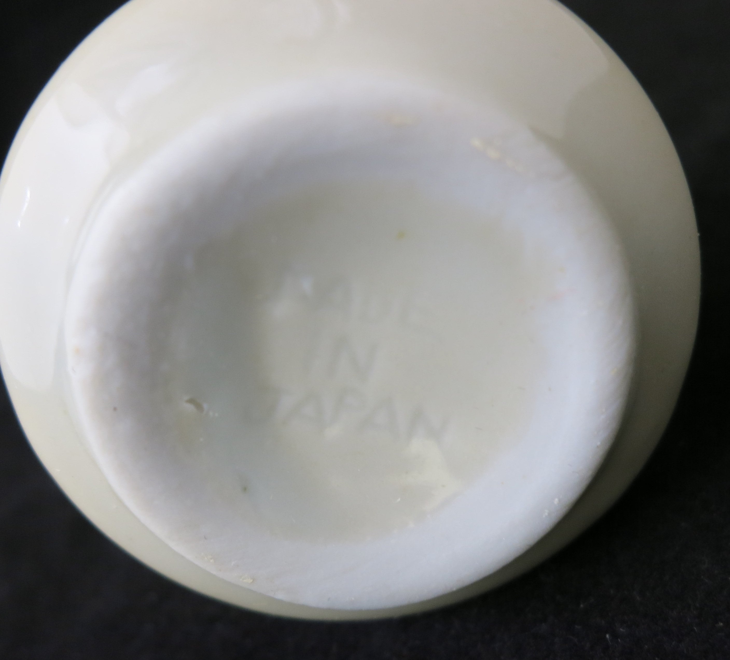 This charming little vase is Stamped made in Japan on the bottom it has a white glaze. No chips, cracks of crazing. It's in fabulous condition! It measures just under 3" tall & 2.75" across.