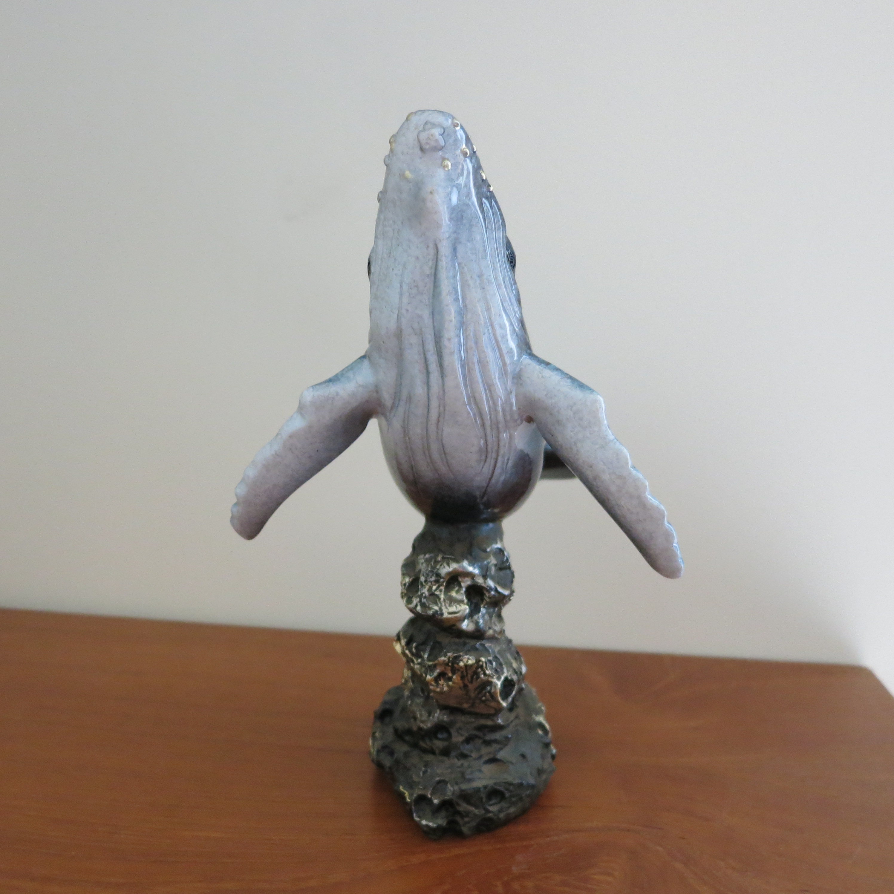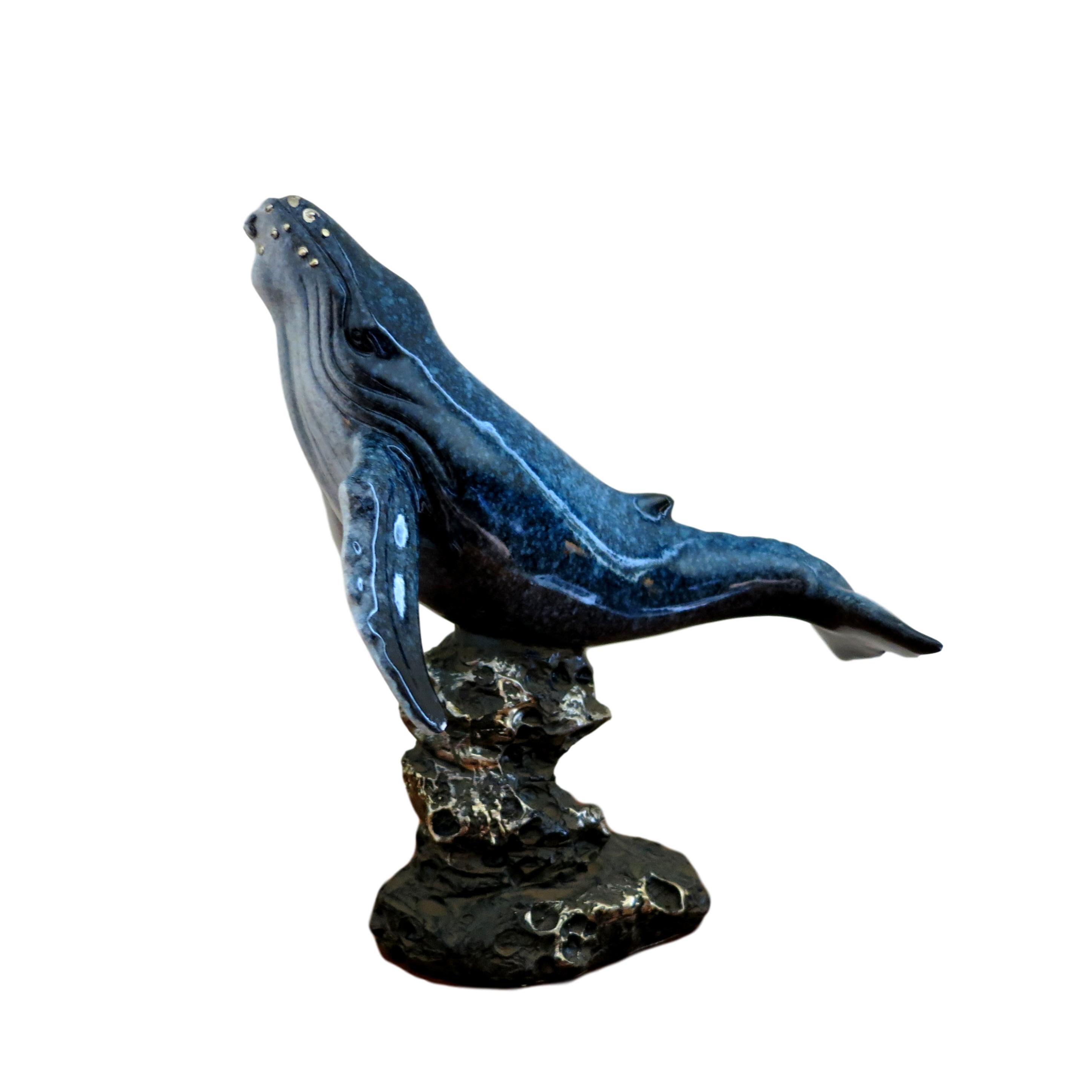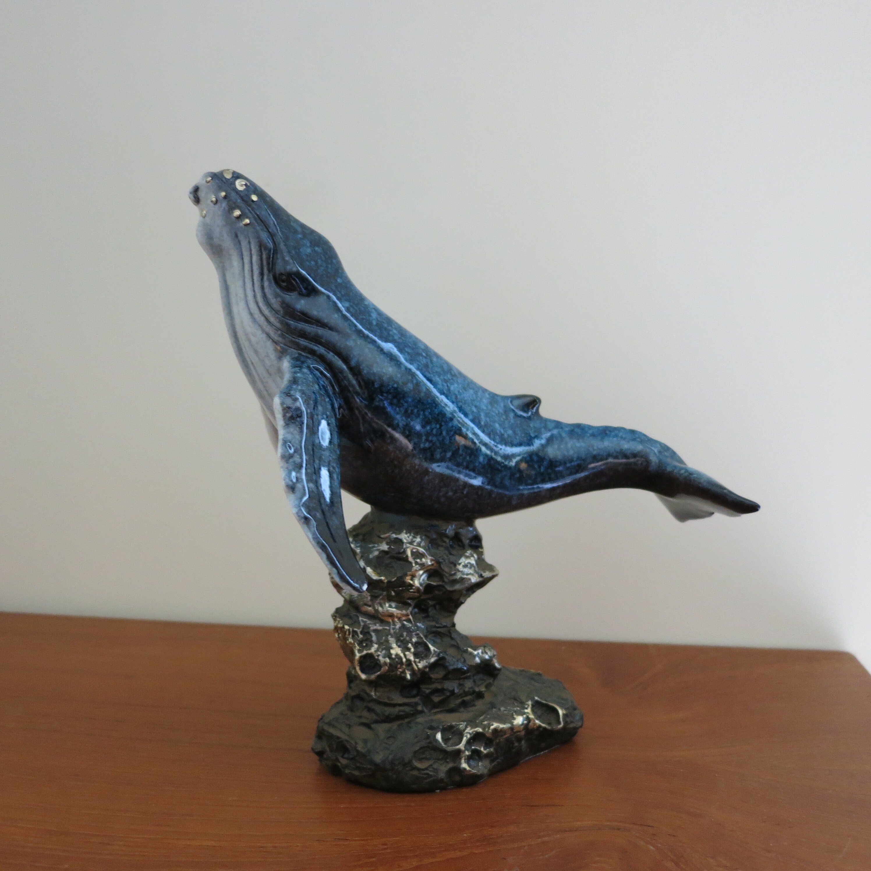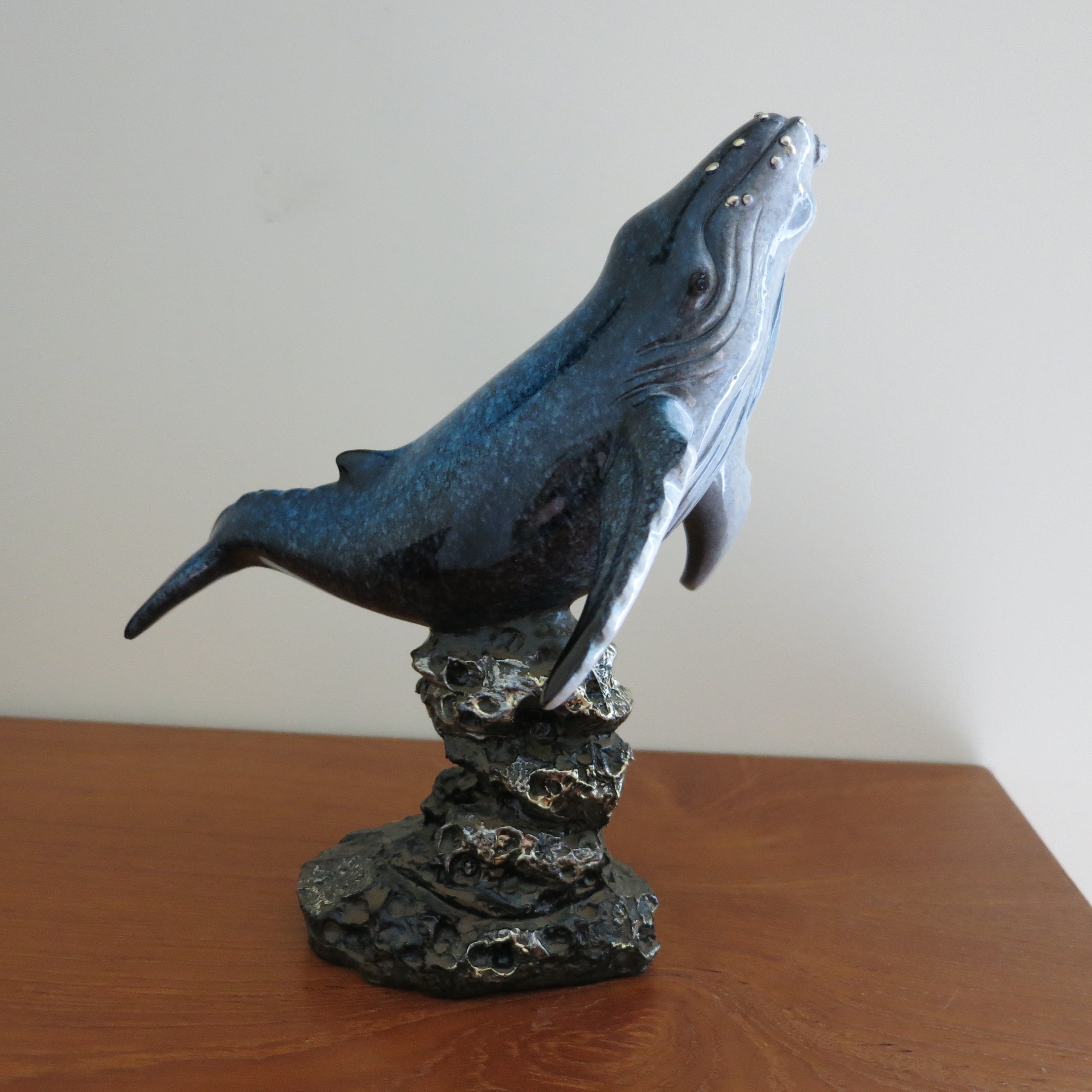 This stunning humpback whale has a color-toned finish on the whale with a bronze look on the base. The piece is made of cold cast resin.