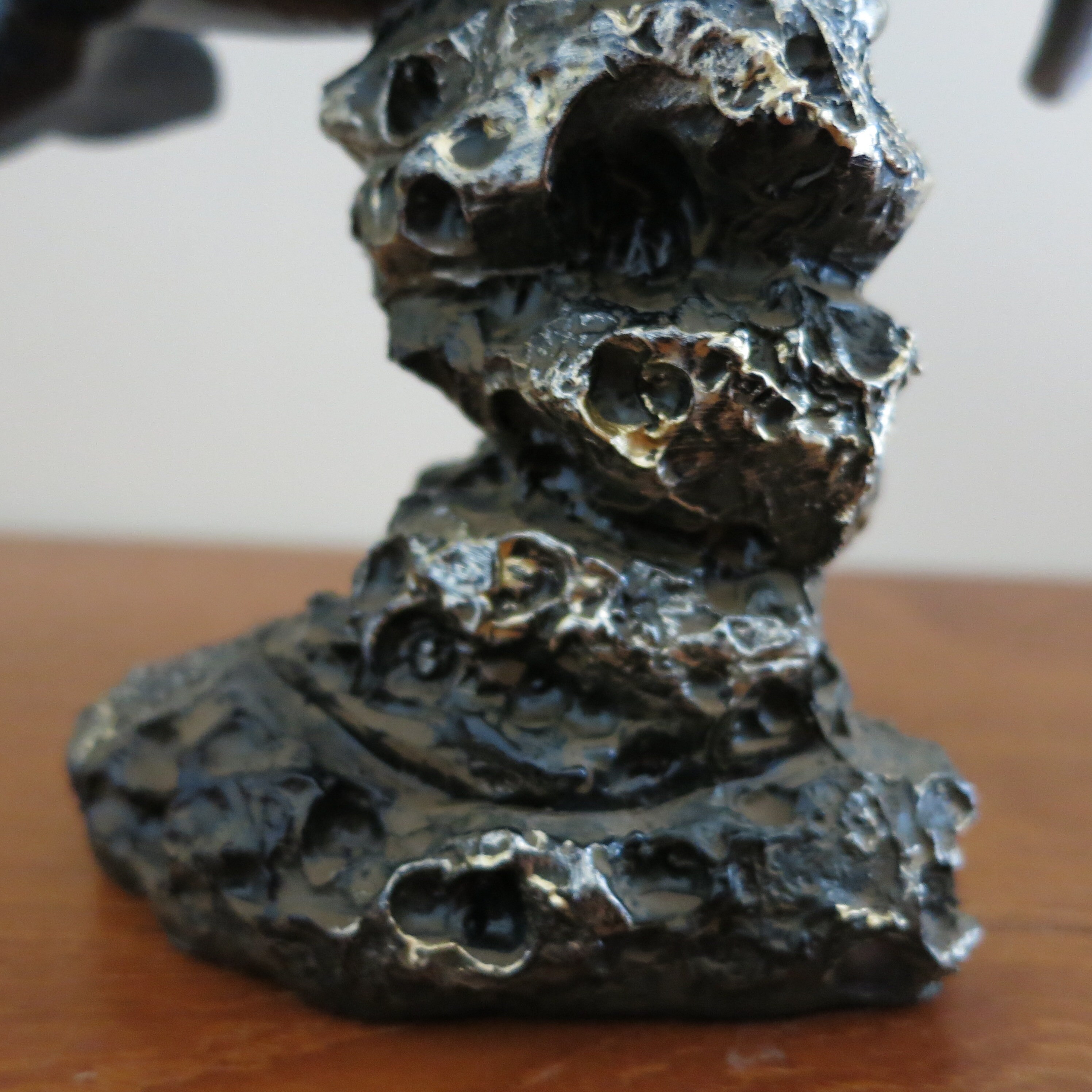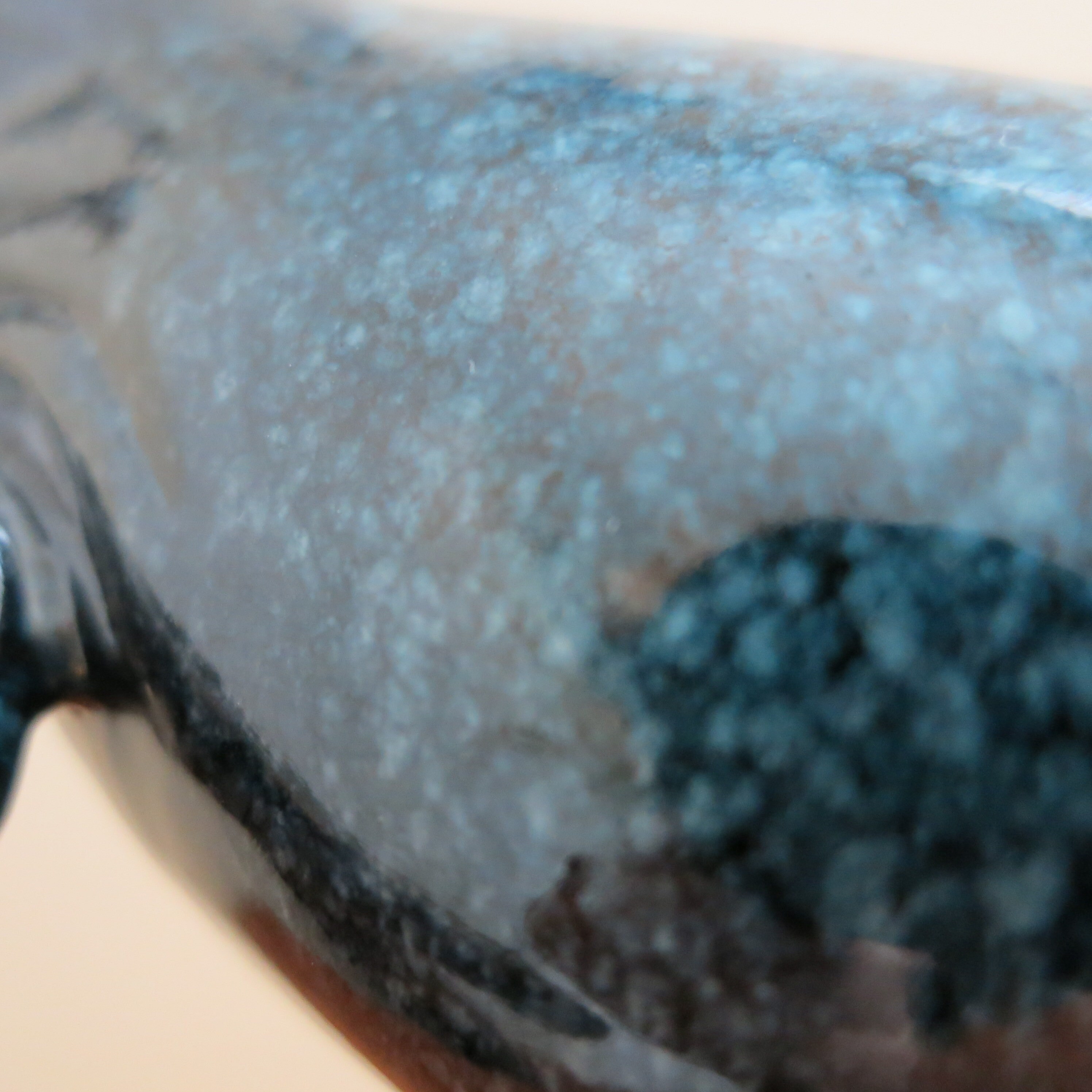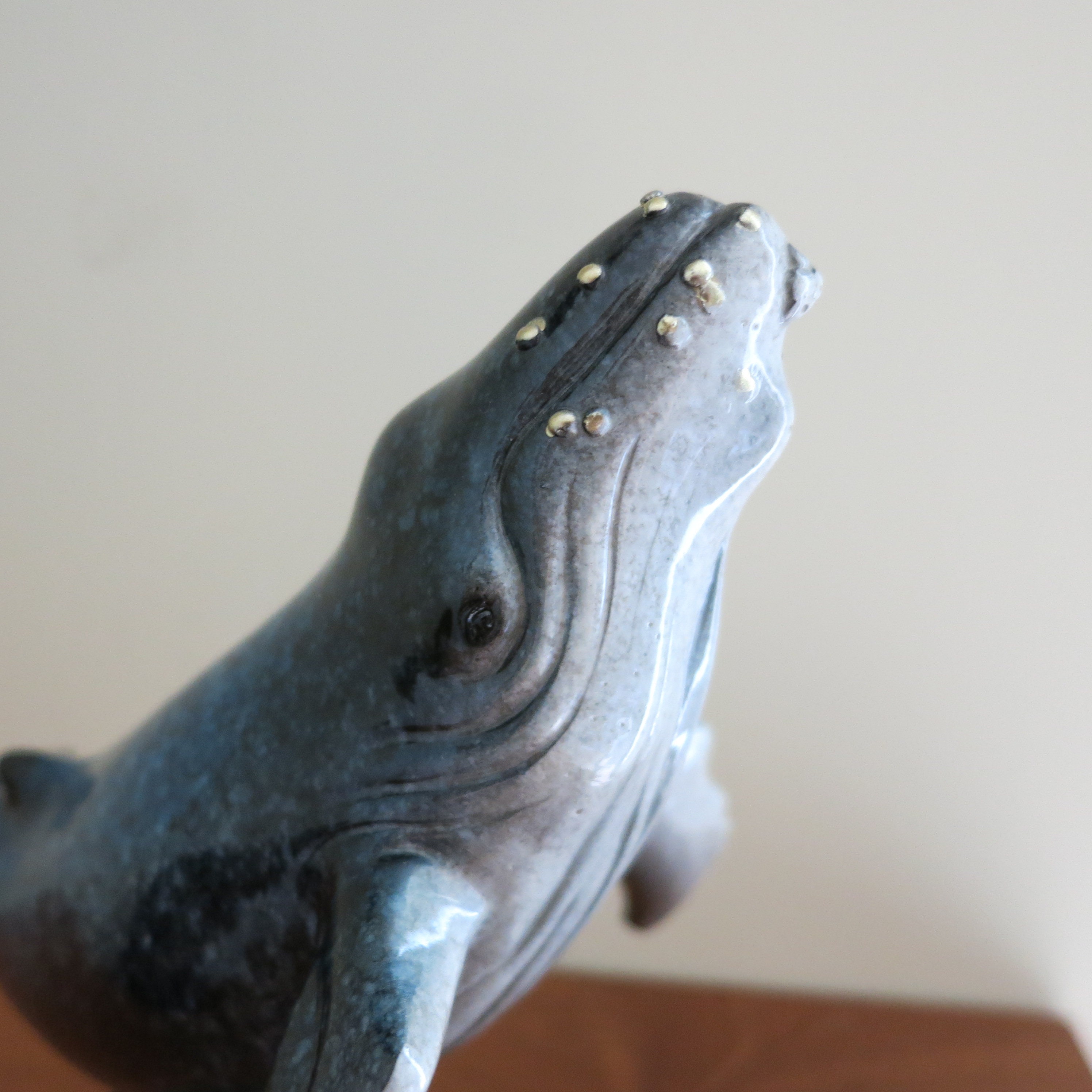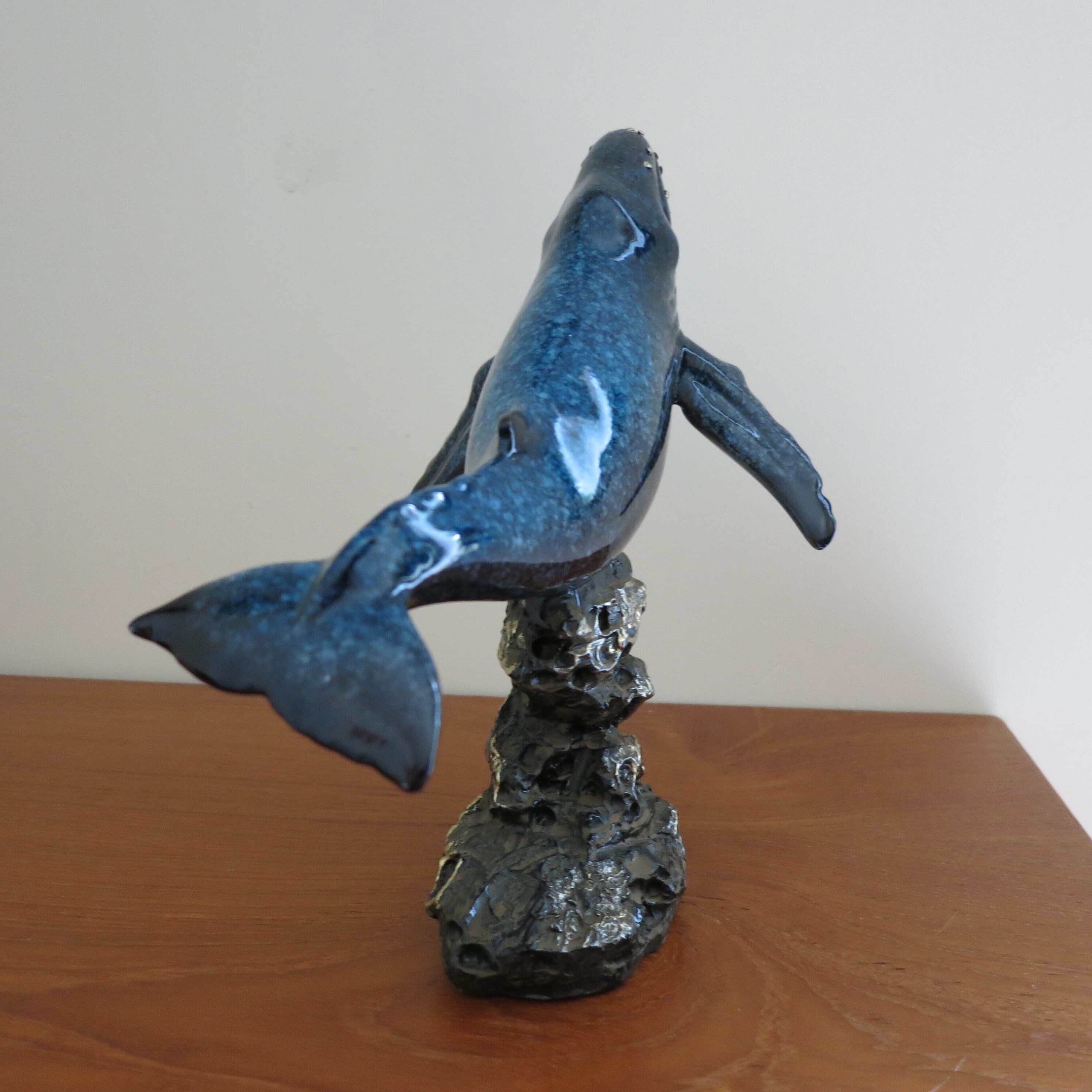 This stunning humpback whale has a color-toned finish on the whale with a bronze look on the base. The piece is made of cold cast resin.