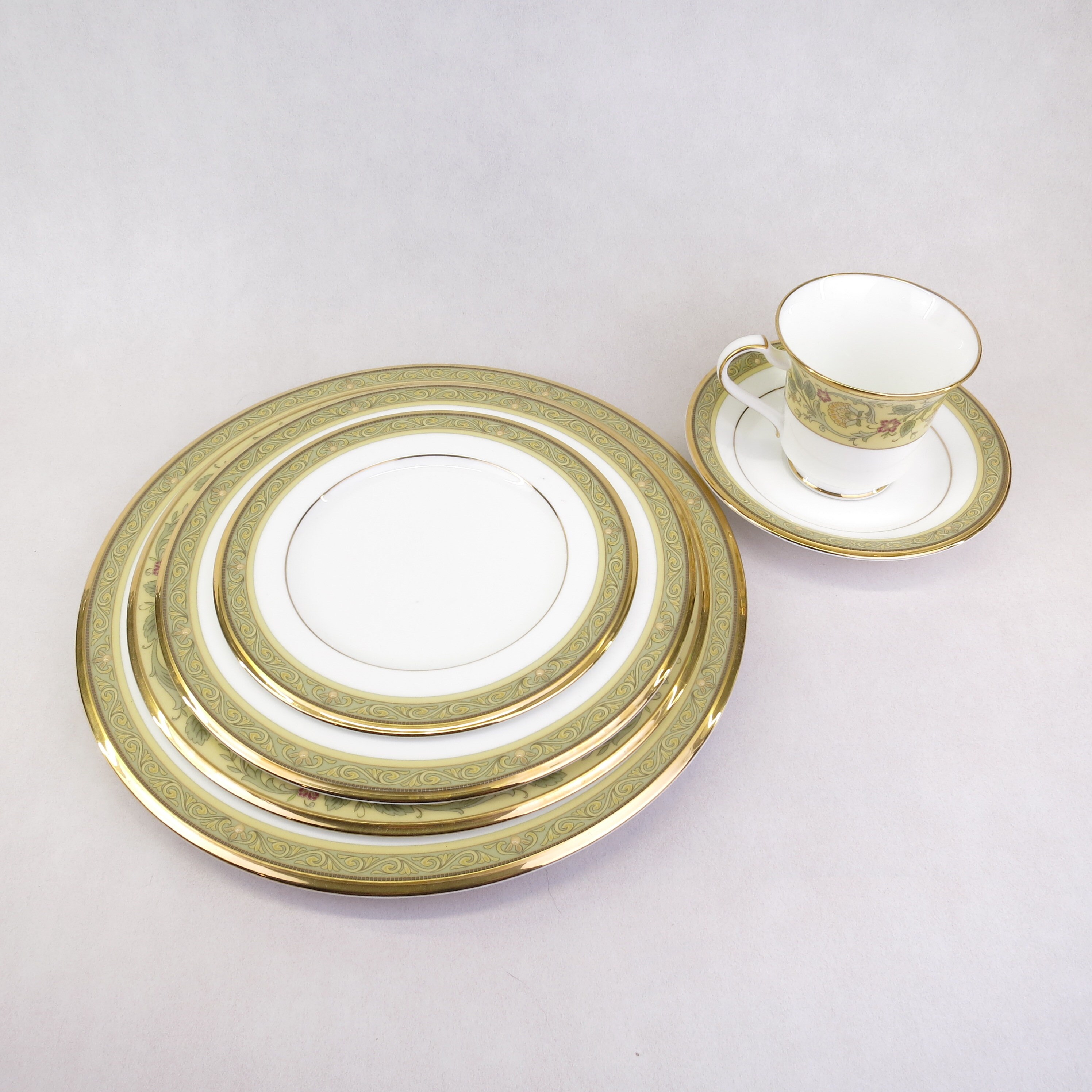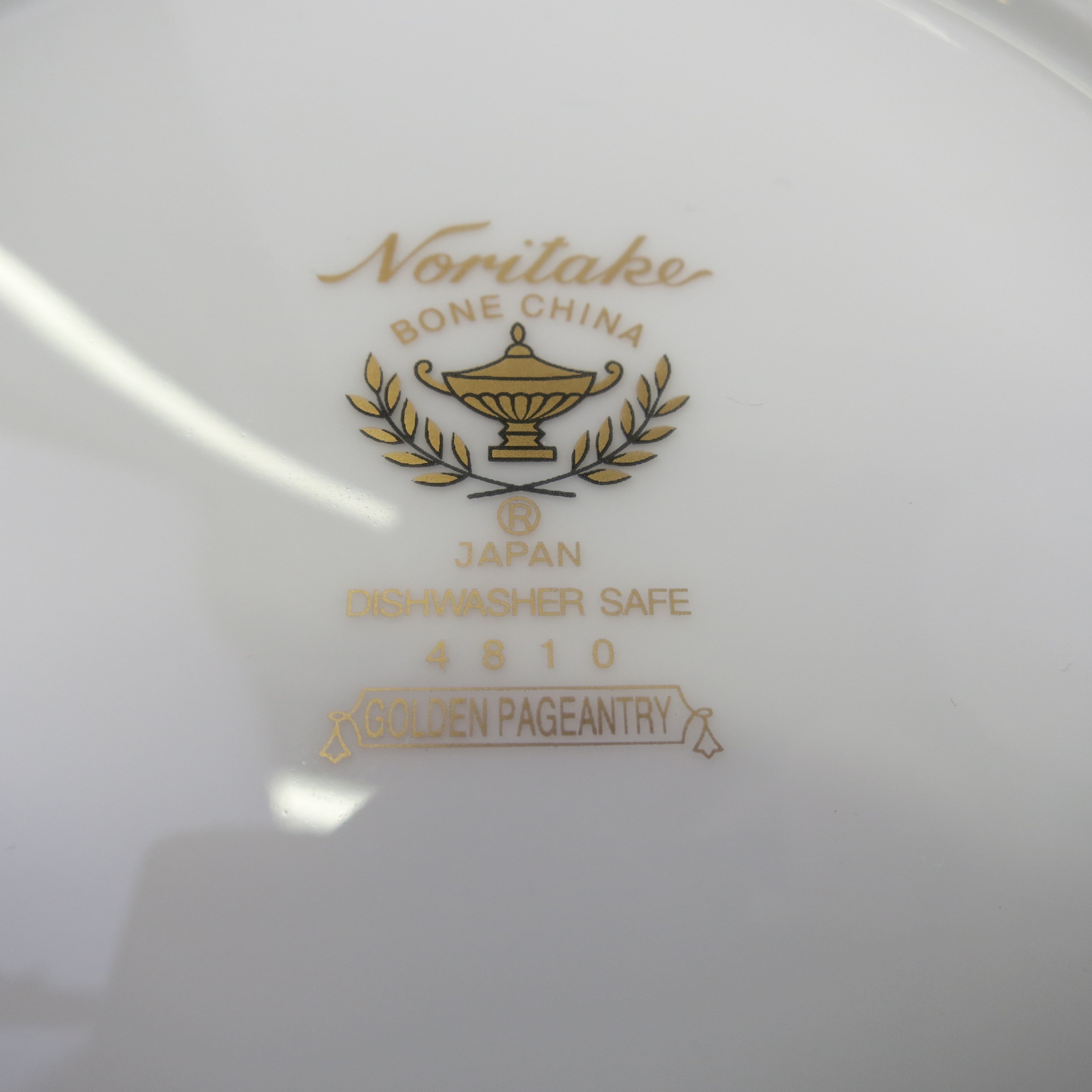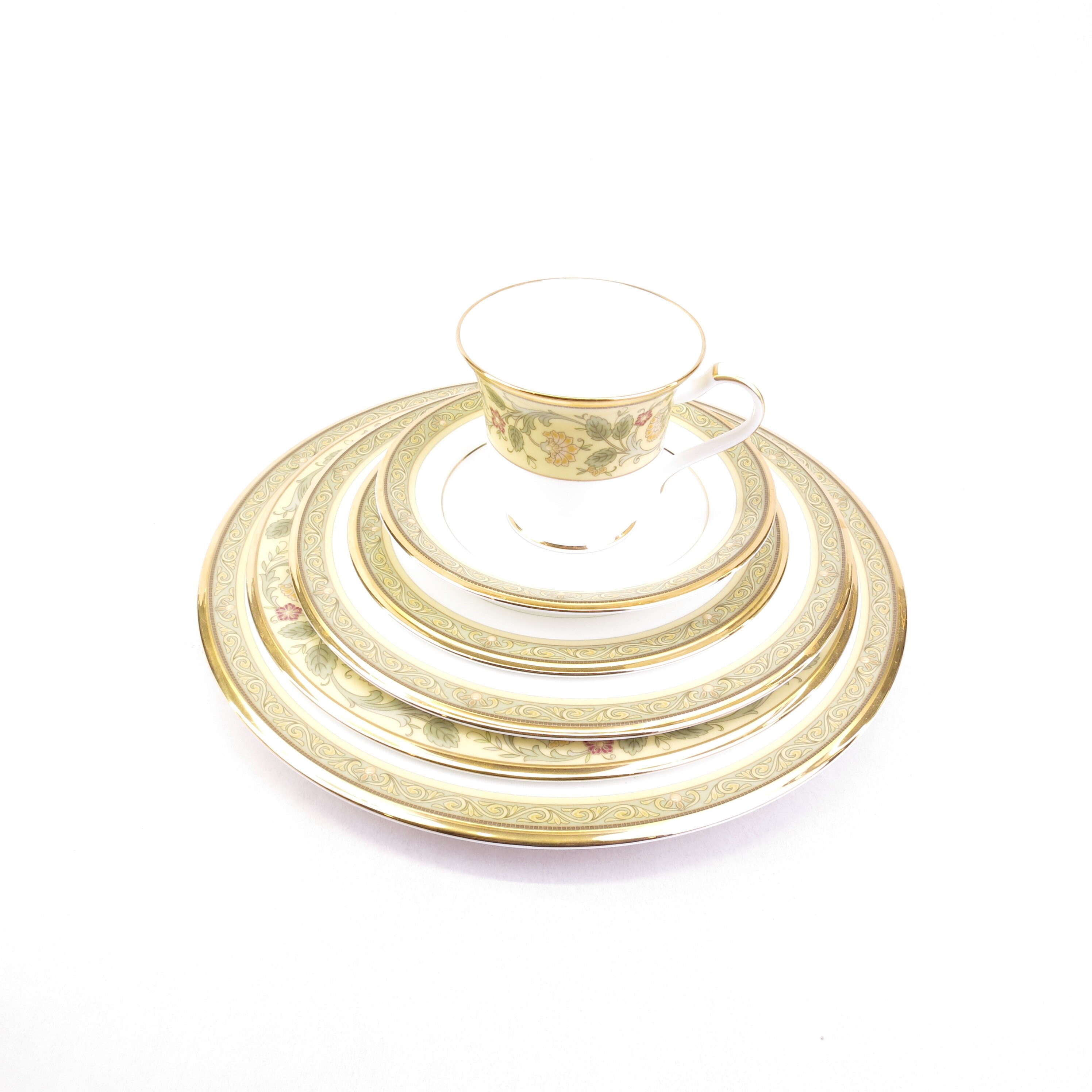 Golden Pageantry is made of the finest white bone china with a heavily applied 24K gold band. The design has the feeling of old world tapestry, elegant and bold, in shades of mustard and rich golds. This pure white, bone china body is as durable as it is beautiful. Extremely light and translucent, Golden Pageantry will add style and class to any table decor. The set contains one, five piece place settings of dinner plate, salad plate, bread and butter plate, cup and saucer. Plus a Accent Luncheon Plate Golden Pageantry 9 1/2 in.