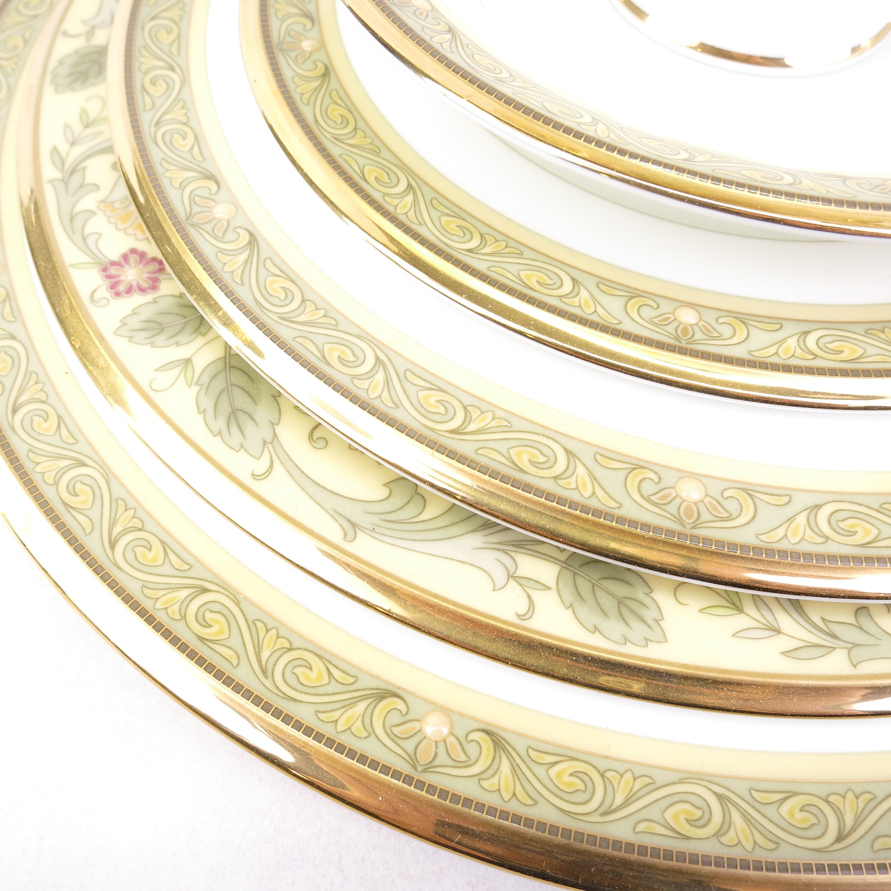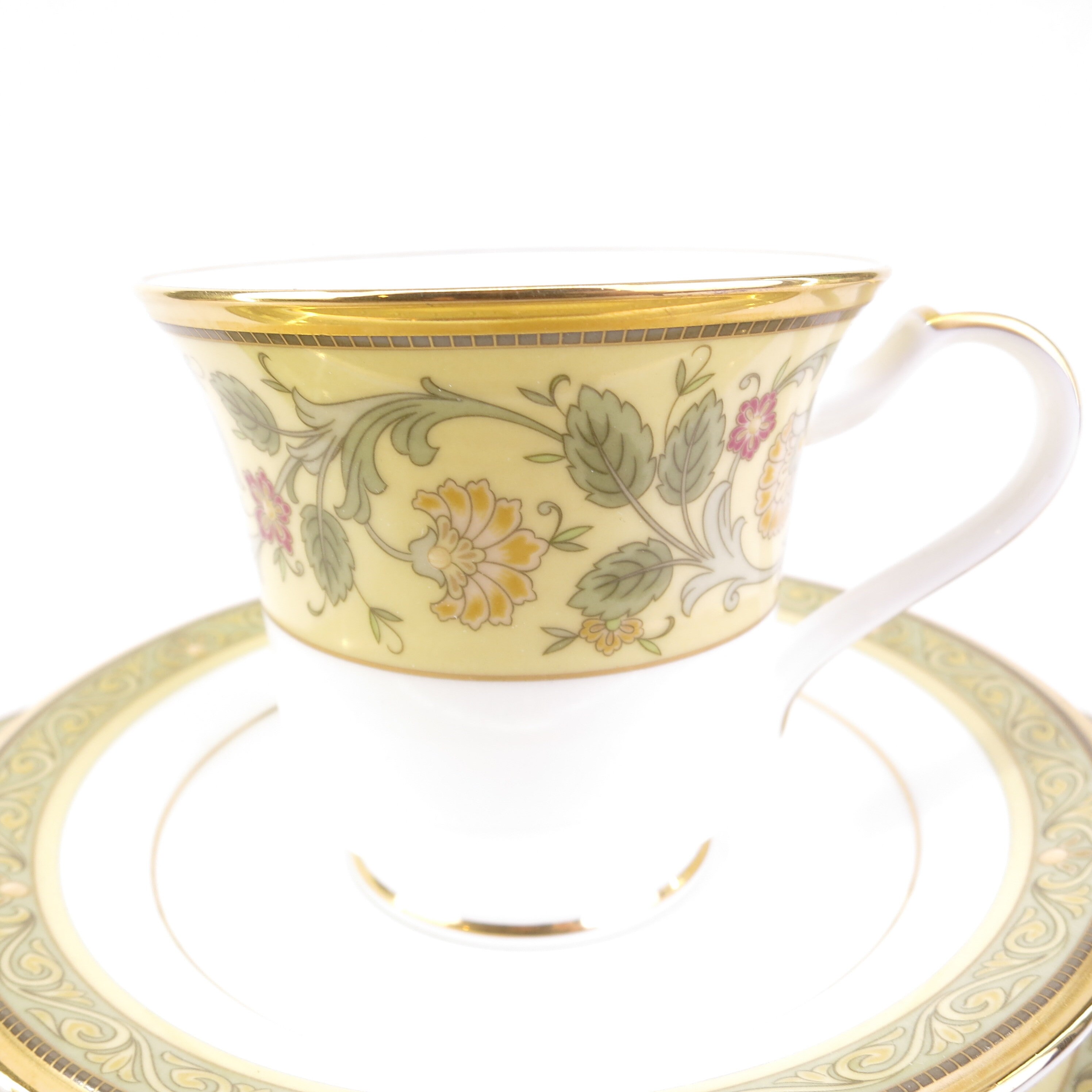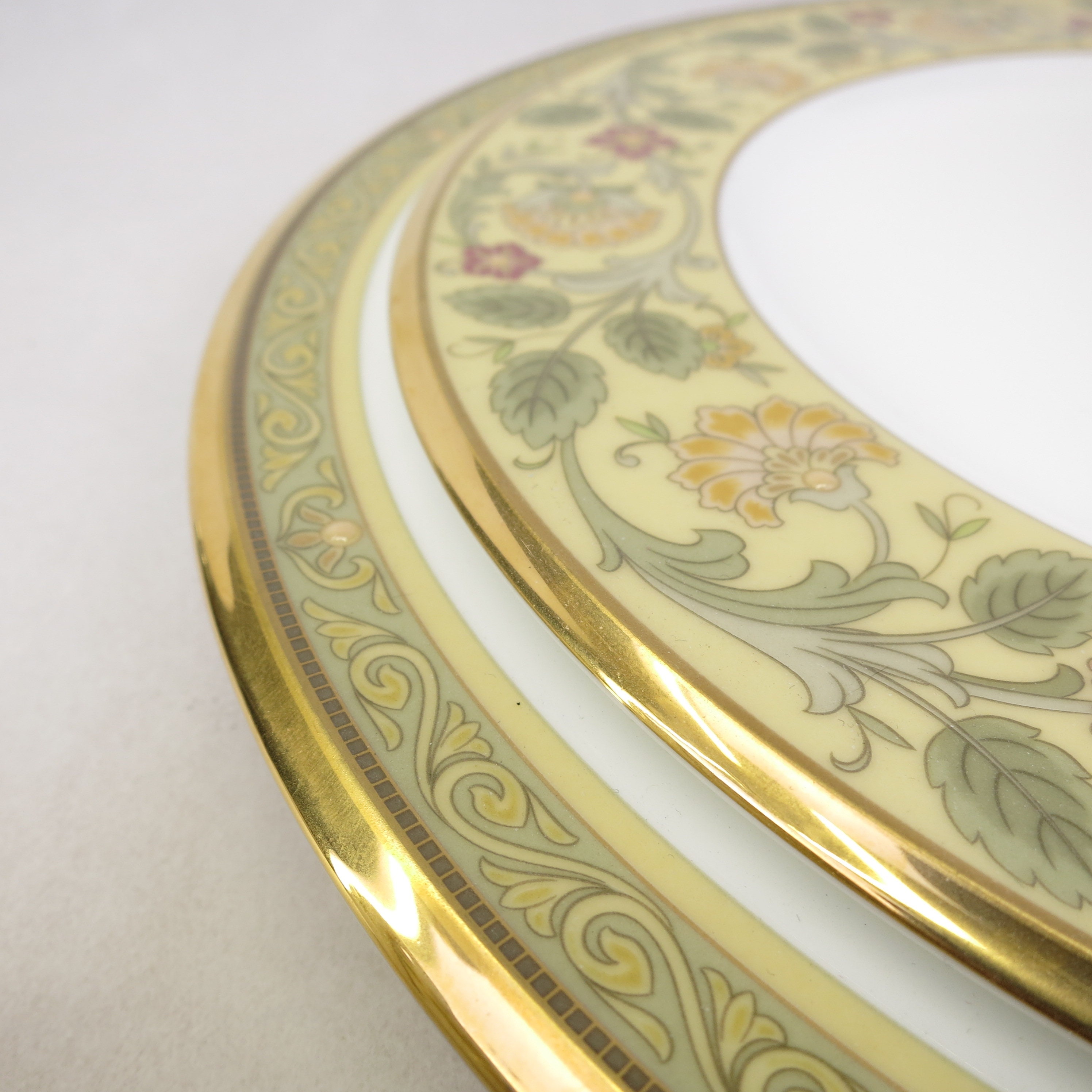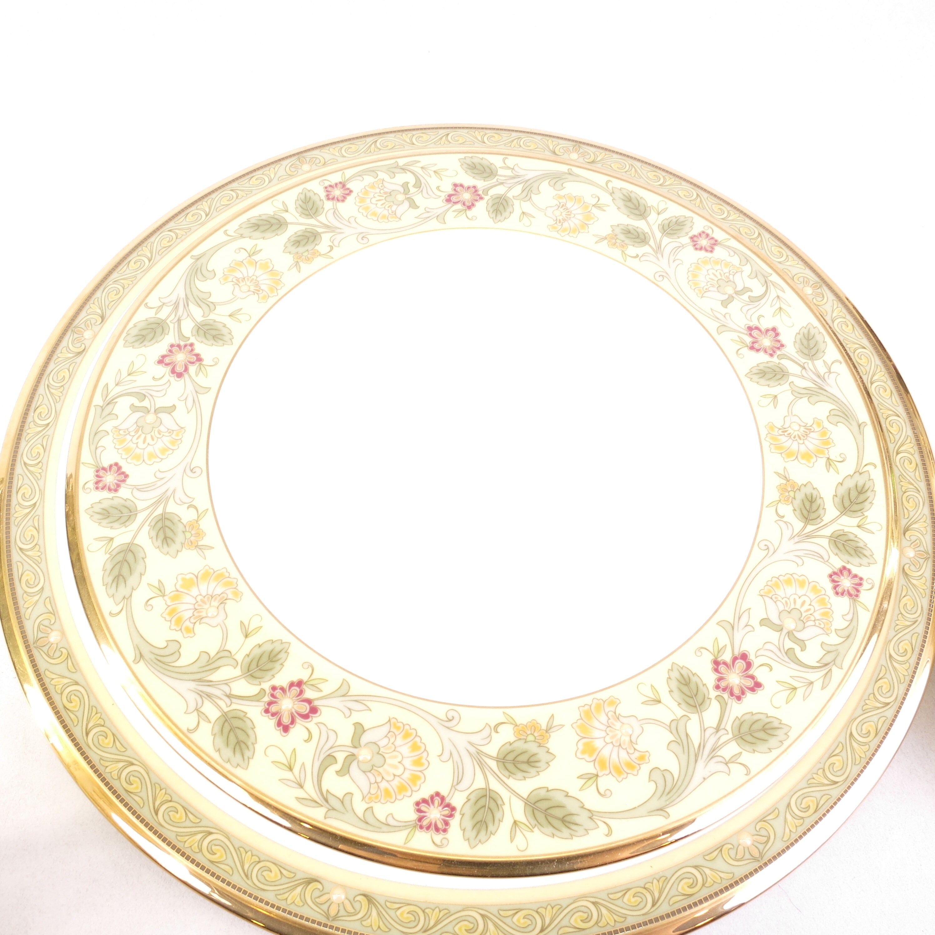 Golden Pageantry is made of the finest white bone china with a heavily applied 24K gold band. The design has the feeling of old world tapestry, elegant and bold, in shades of mustard and rich golds. This pure white, bone china body is as durable as it is beautiful. Extremely light and translucent, Golden Pageantry will add style and class to any table decor. The set contains one, five piece place settings of dinner plate, salad plate, bread and butter plate, cup and saucer. Plus a Accent Luncheon Plate Golden Pageantry 9 1/2 in.
