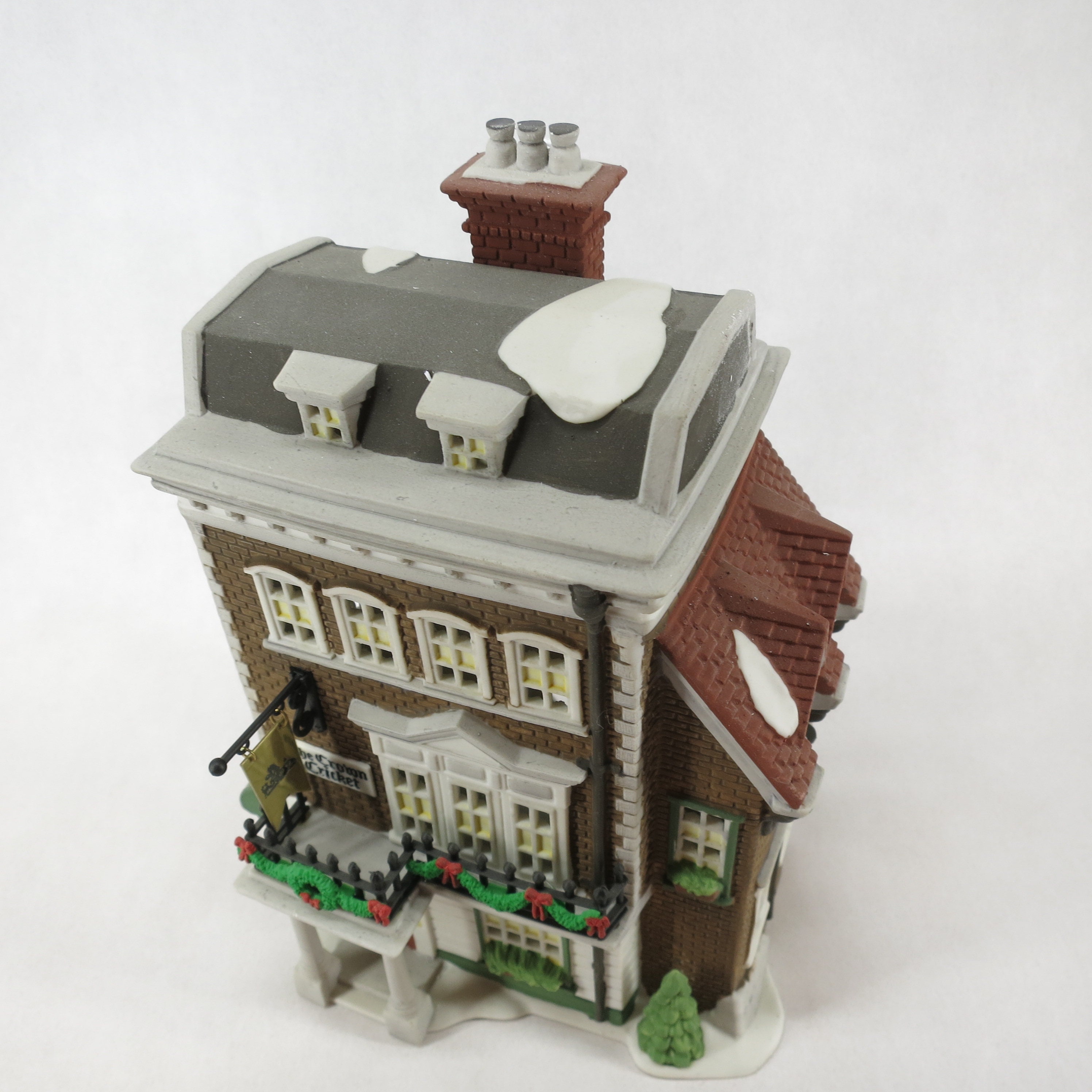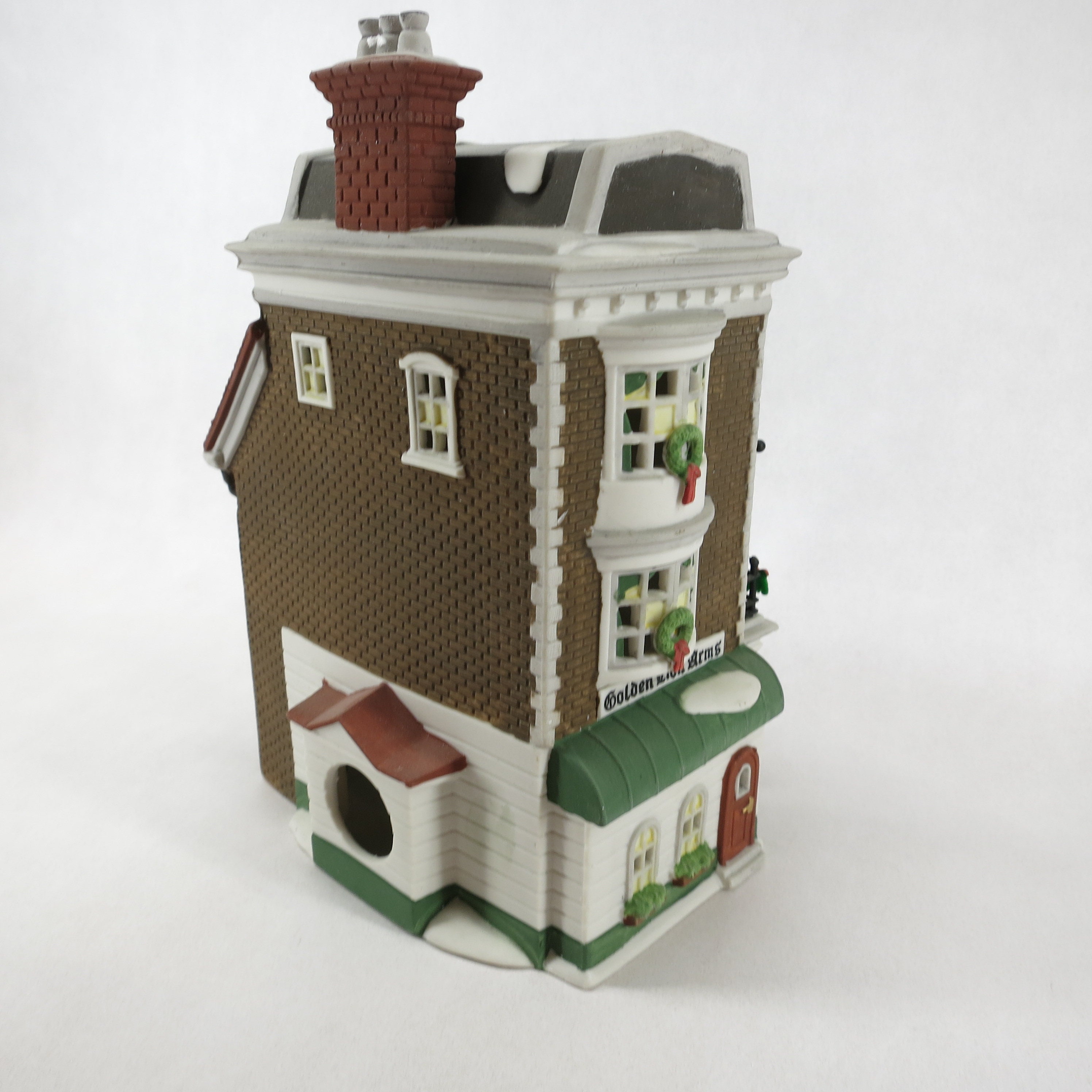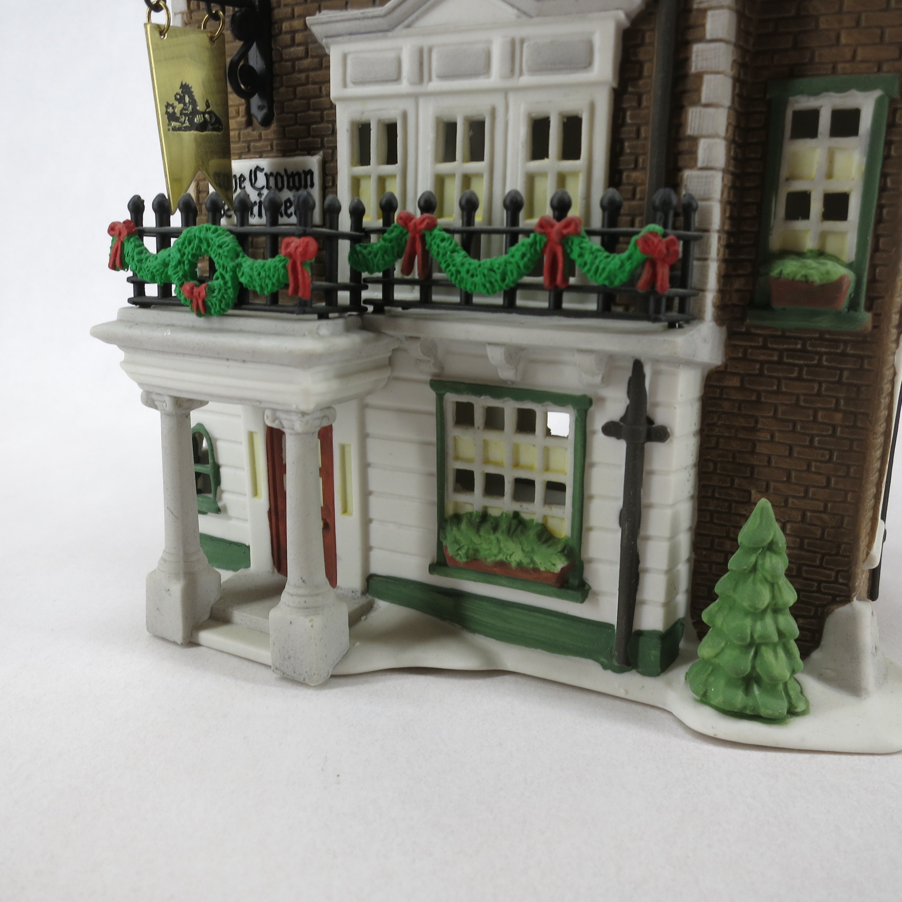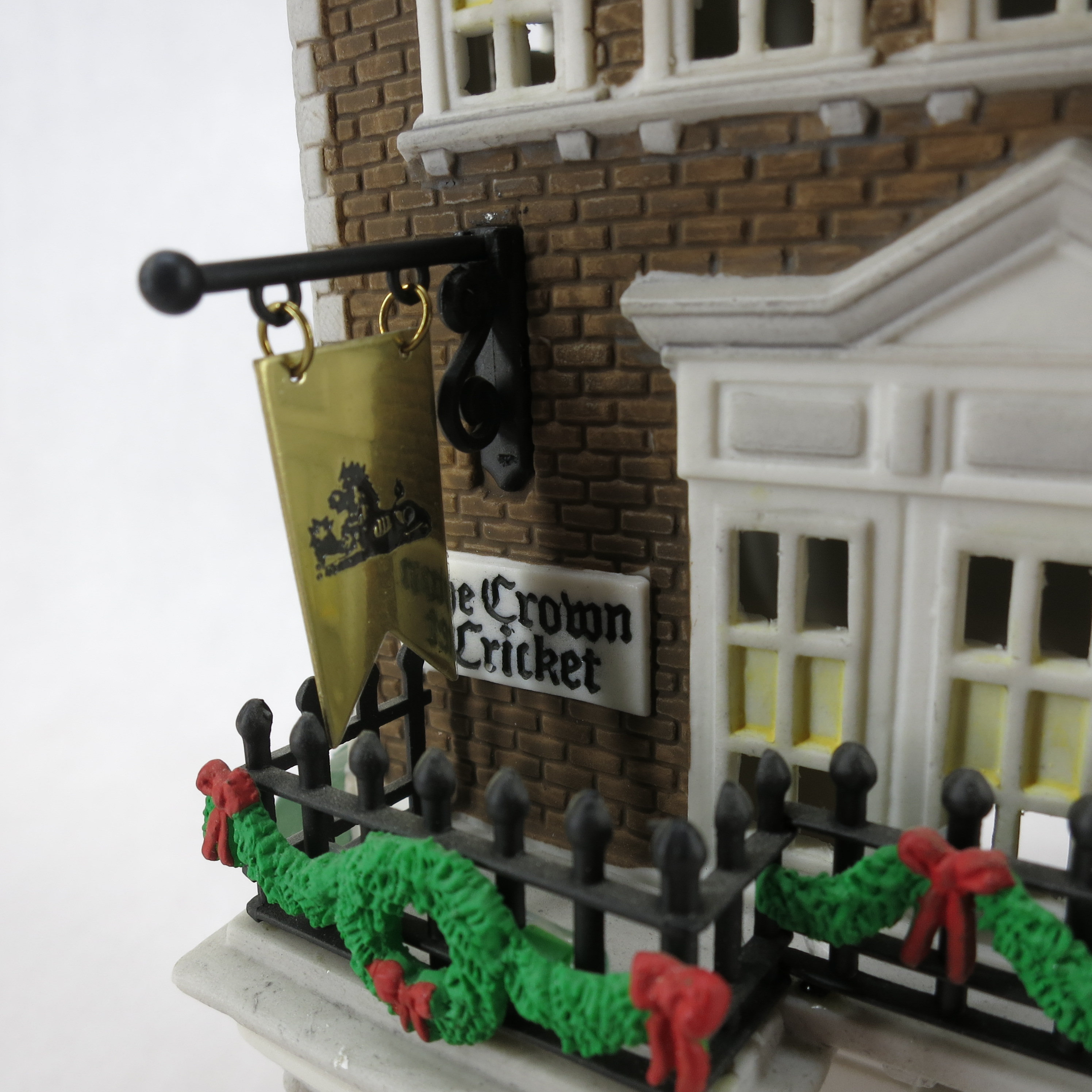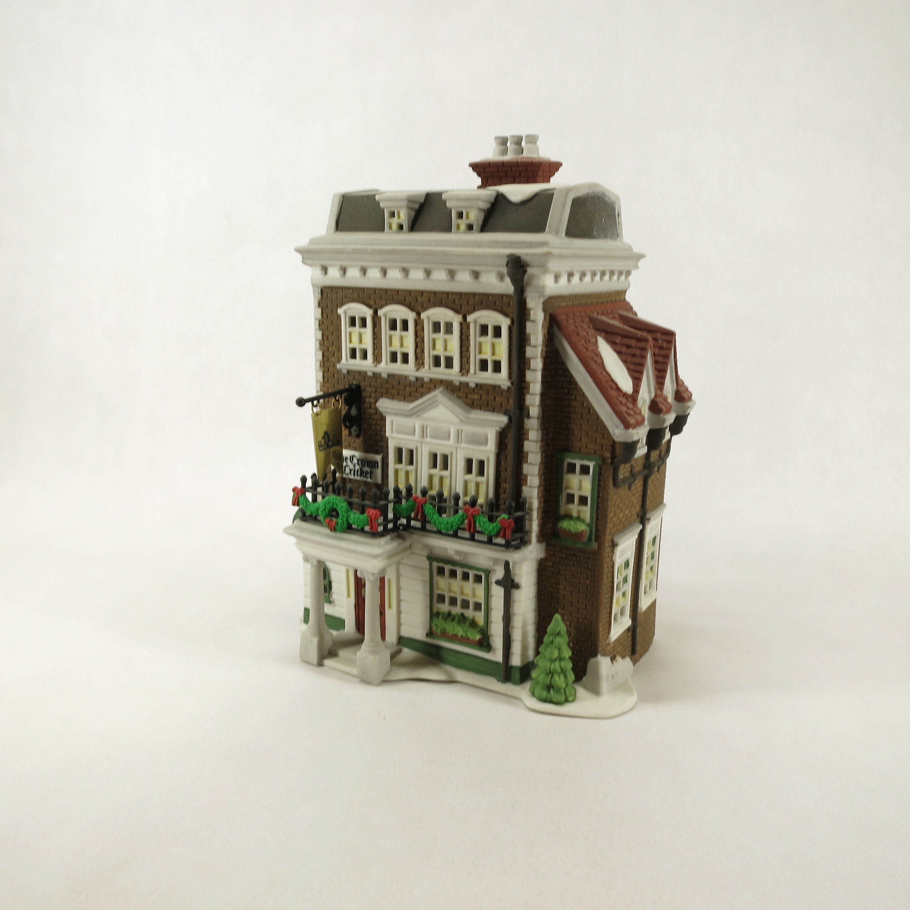 Dept. 56 Dickens Village "Crown & Cricket Inn" #5750-9 introduced in 1991 and retired in 1992. This is the 1st Edition in the Charles Dickens Signature Series. This three-story brick and stone building with pillars flanking the covered formal entry, has a curved canopy roof on the Golden Pub. A wrought iron balustrade outlines the triple windows on the second floor. A Mansard roof with decorative trim and molding completes the look. Size: 6 x 4.5 x 8.5''