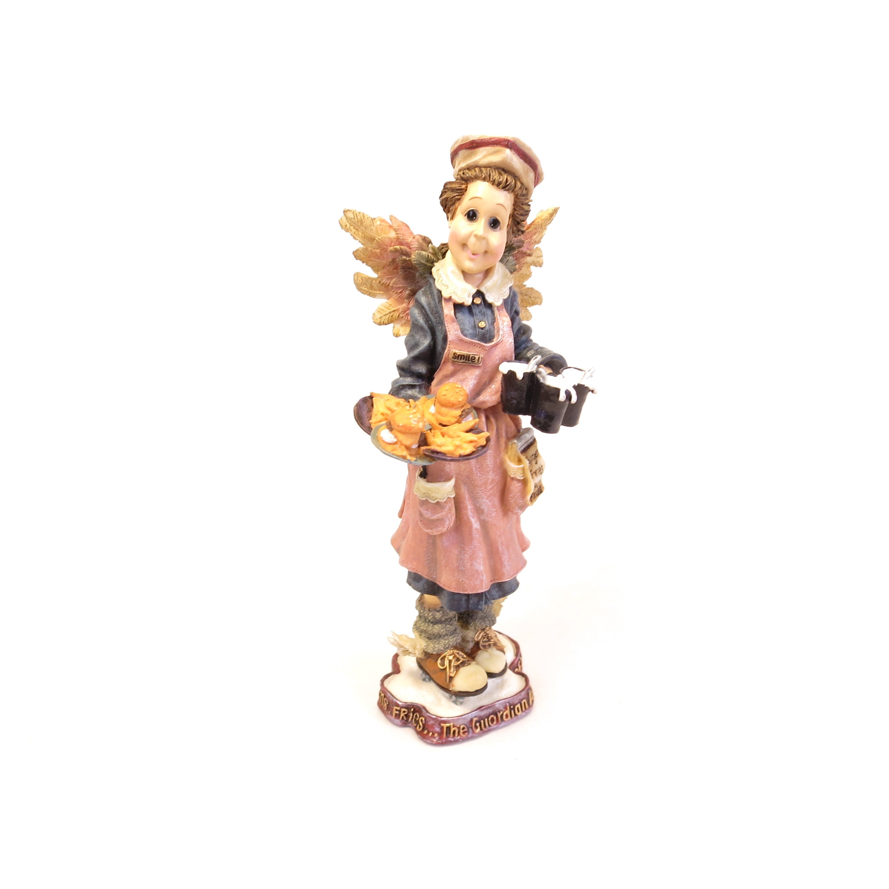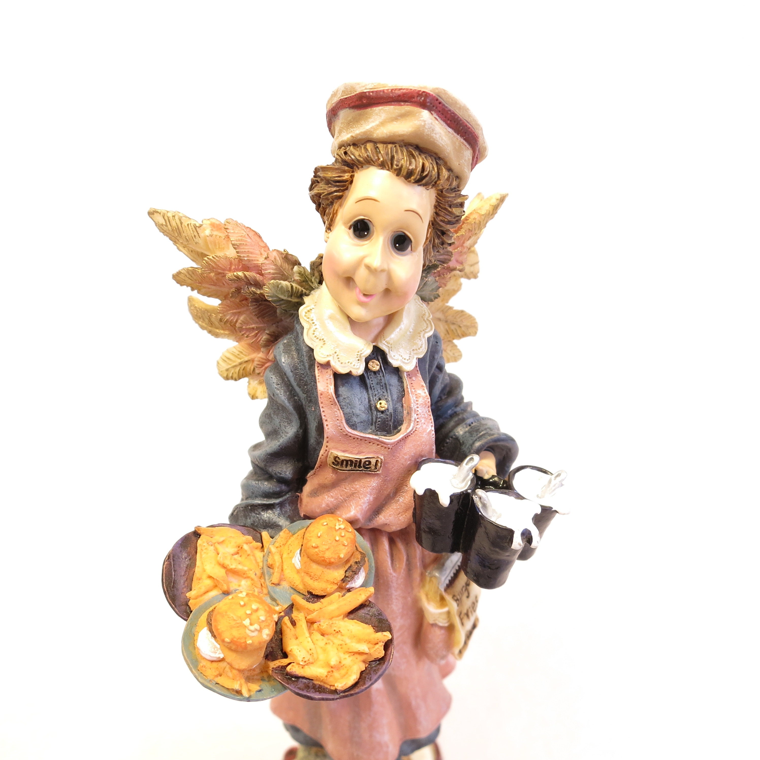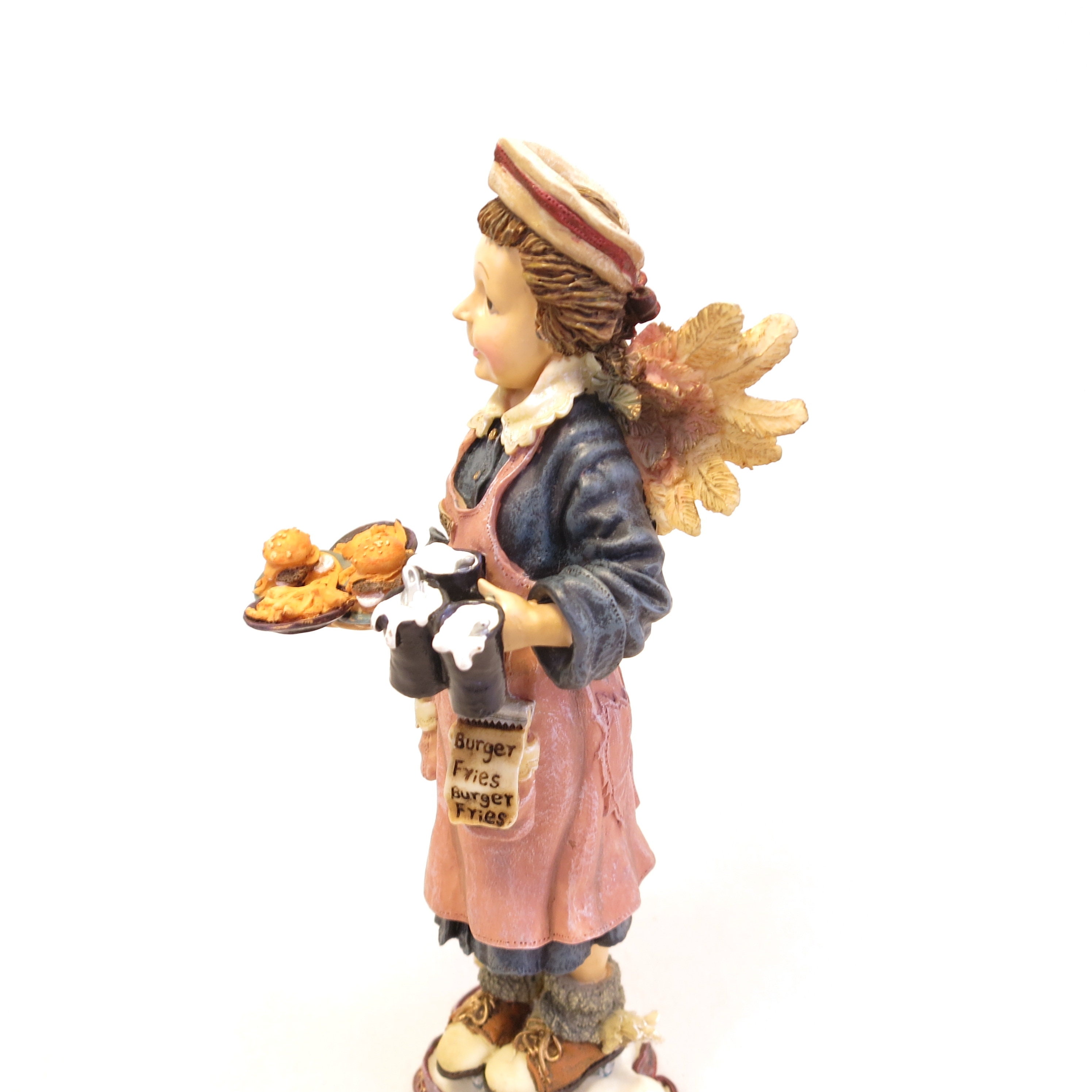 New in box. Folkstone Collection. 1998 Fall Introduction. Gift Creation Concepts. Retired. Lady angel holding a tray of hamburgers and french fries. In original box.