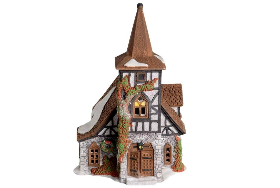 Dept 56 "Old Michael Church" Dickens Village #55620 Introduced in 1992, Retired in 1996. Stone base with lath and plaster filling space between timbered upper portion. Tower rises up front facade with heavy solid look, a simple four-sided structure. Double wood doors at rear of church.