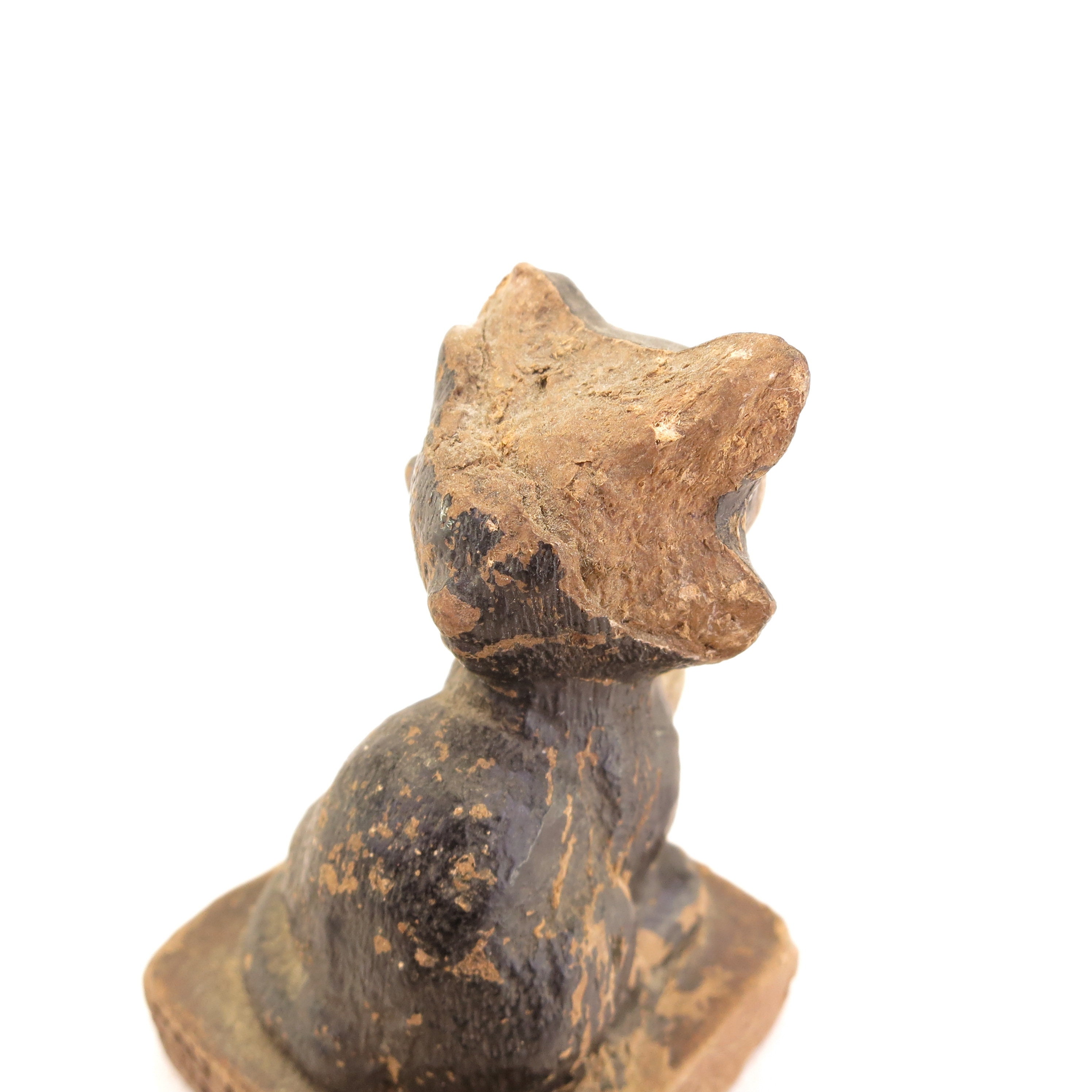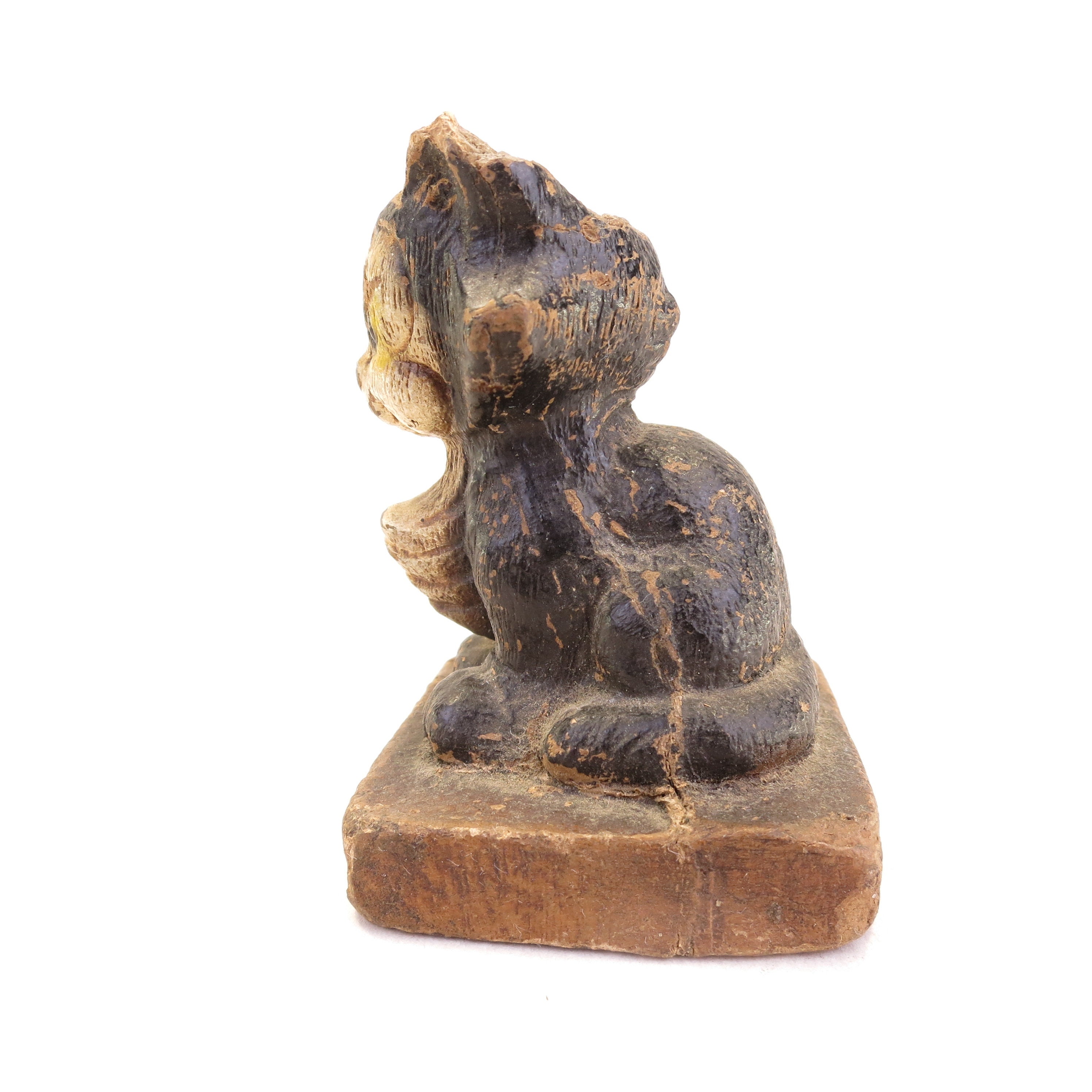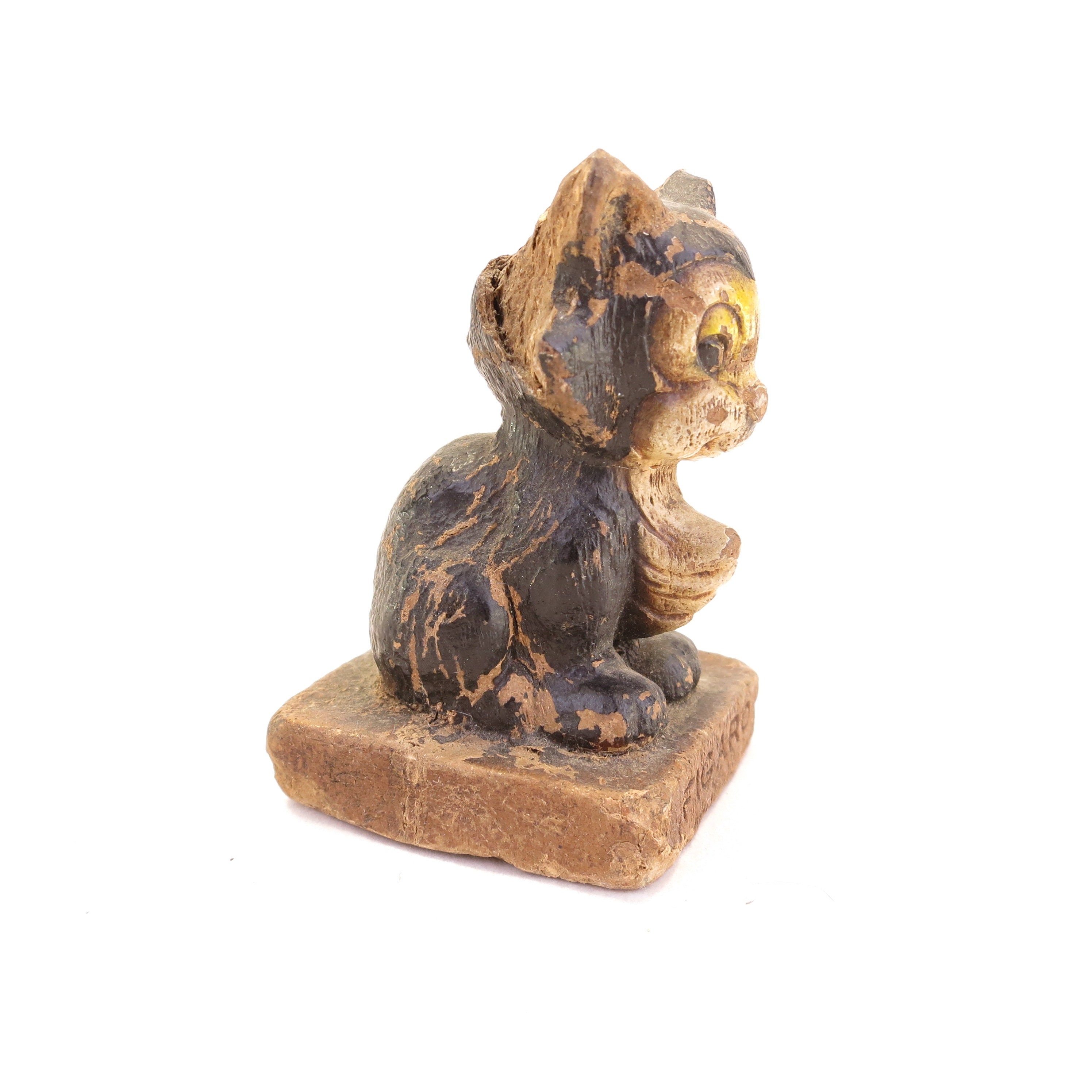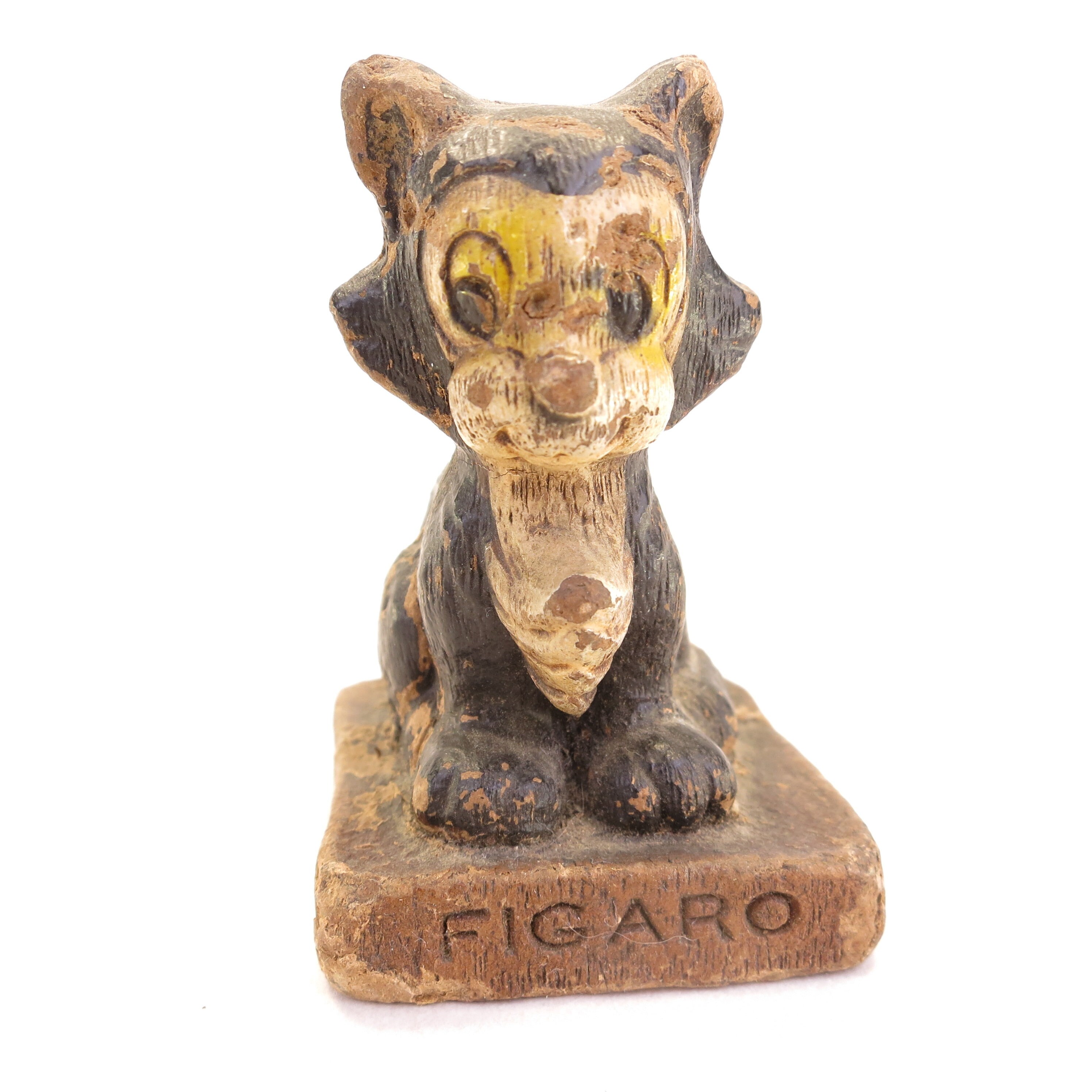 This figurine is a Syroco 1942 Pinocchio's Figaro wood carving and hand painted piece. He stands 2.5" tall. This piece has vintage wear, with missing paint, head damage and rough edges. It's super charming!